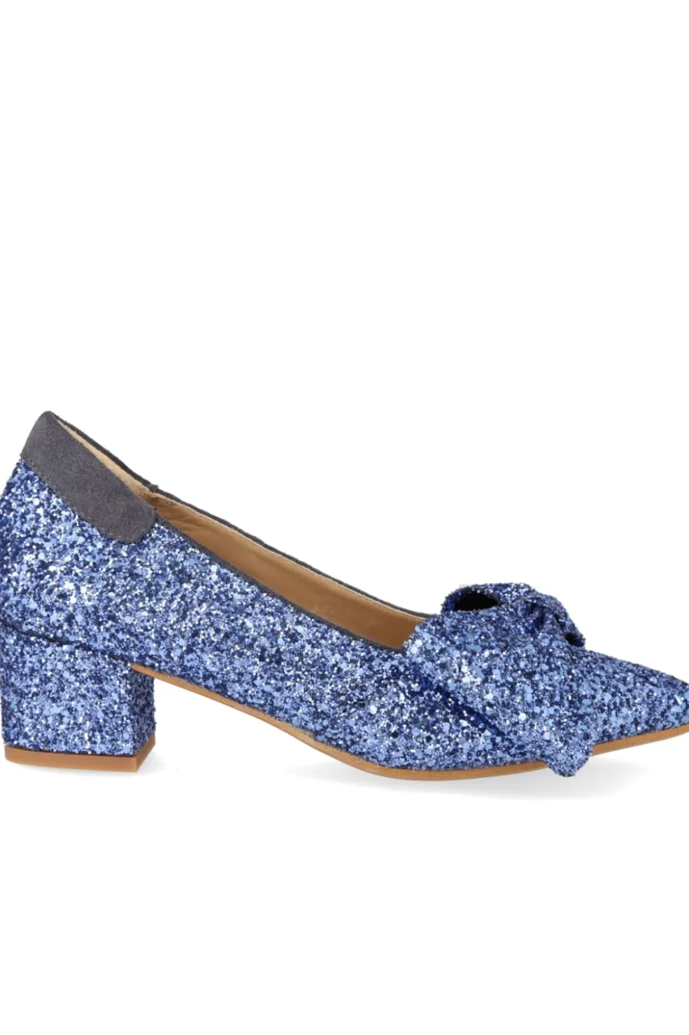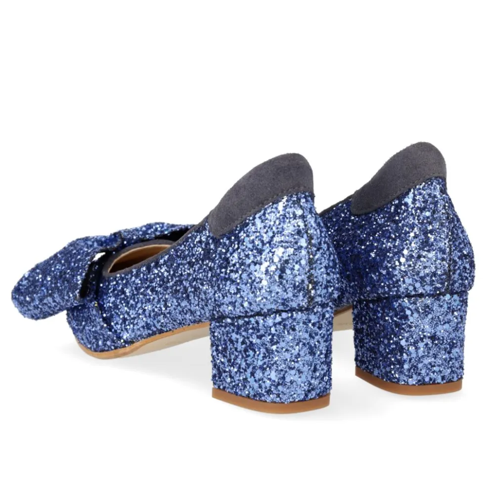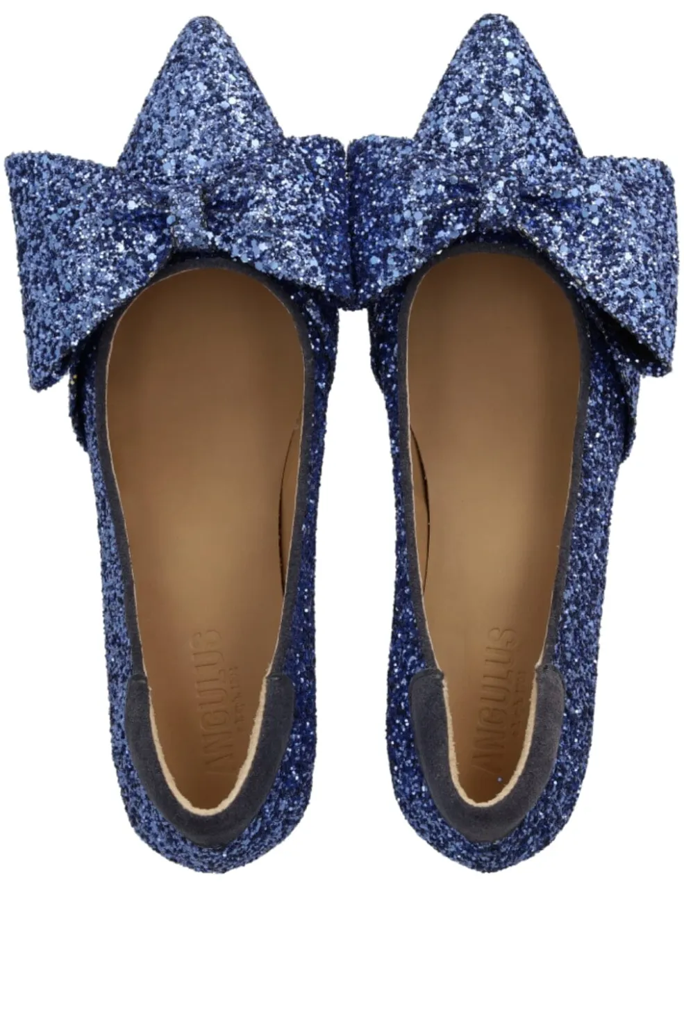 Stiletter fra Angulus i mørkeblå med glitter. Skoene har spids tå, skindfor og sløjfedetaljer, der gør dem velegnede til festlige anledninger.