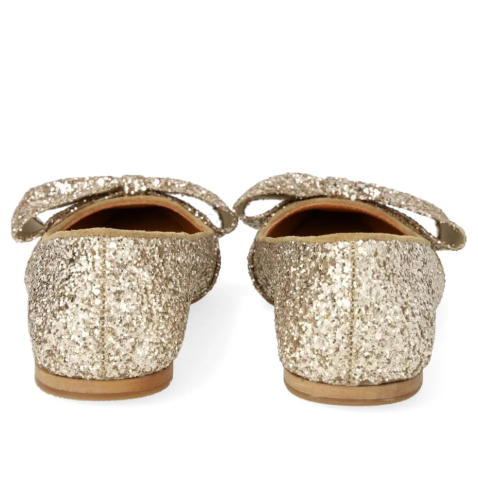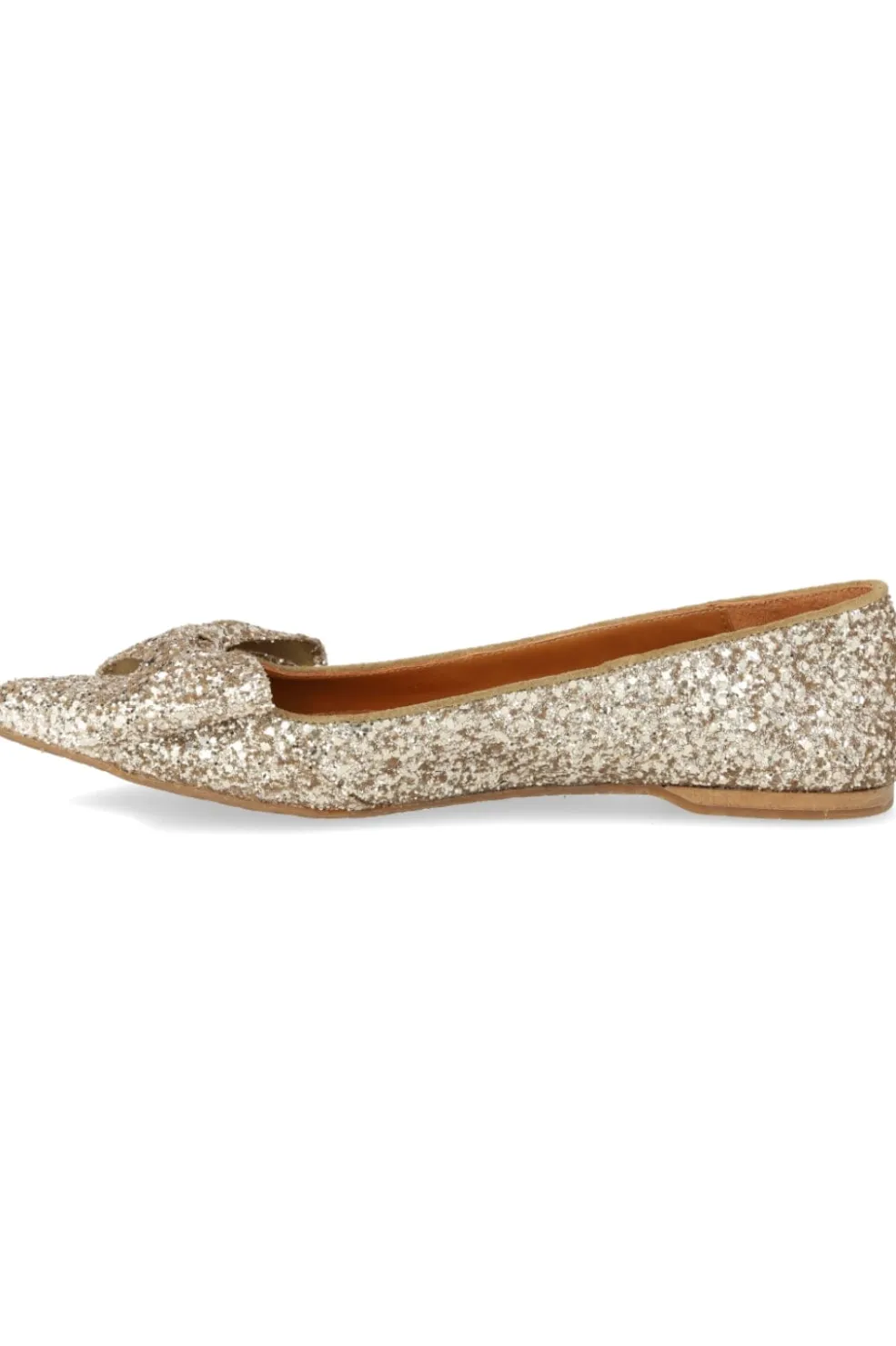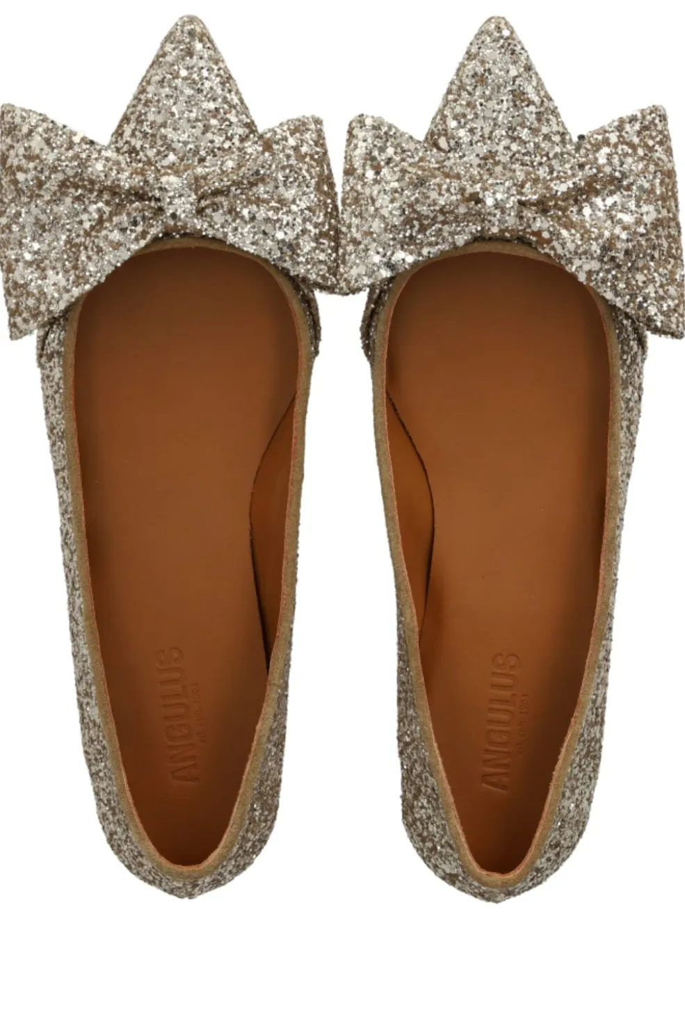 Ballerina-sko fra Angulus i champagnefarvet glitter med sandfarvet tone. Skoen har en spids tå og er pyntet med sløjfer og pailletter, der giver et festligt udtryk.