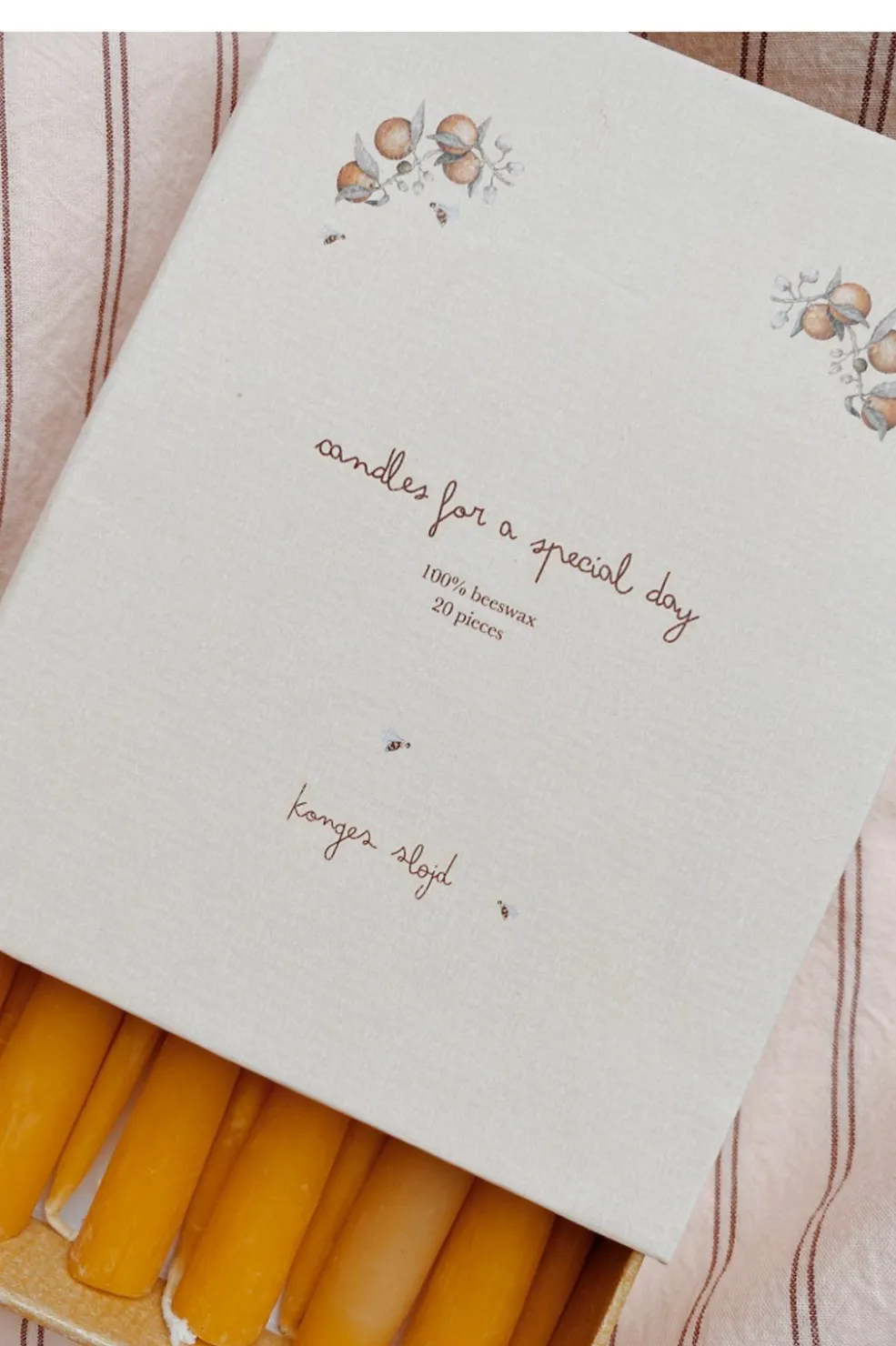 Gule fødselsdagslys fra Konges Sløjd i en tændstikæske. Lysene er lavet af bivoks og kommer i en naturfarvet udgave med en brændetid på op til 2 timer.