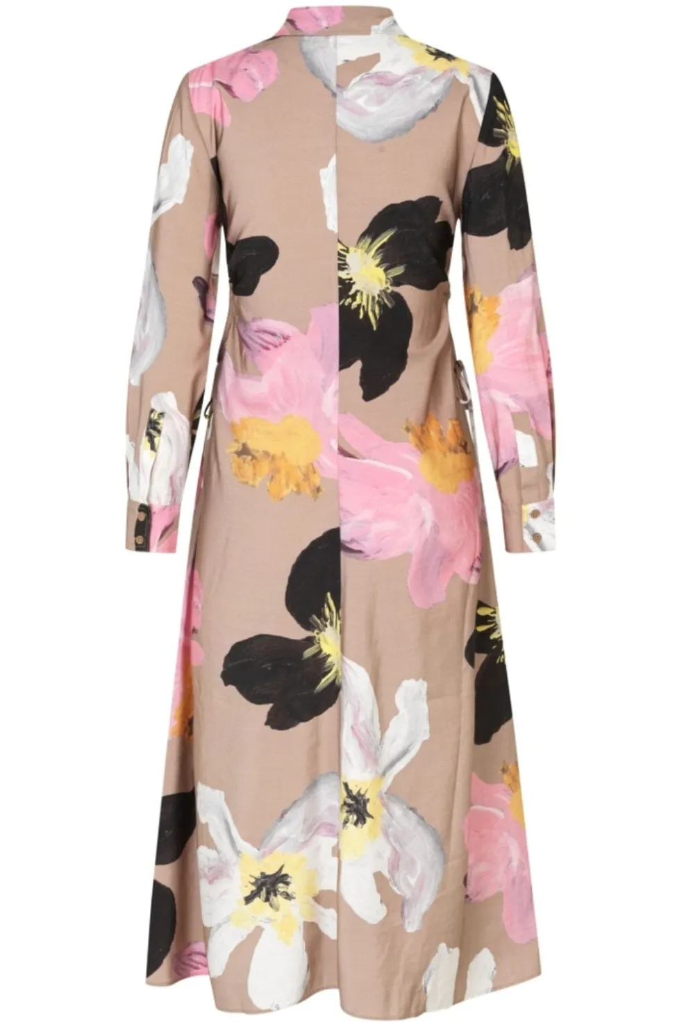 Skjortekjole fra Stine Goya med beige baggrund og store blomster i sort, pink, hvid og gul. Kjolen har lange ærmer og skjortekrave med bindebånd i taljen.