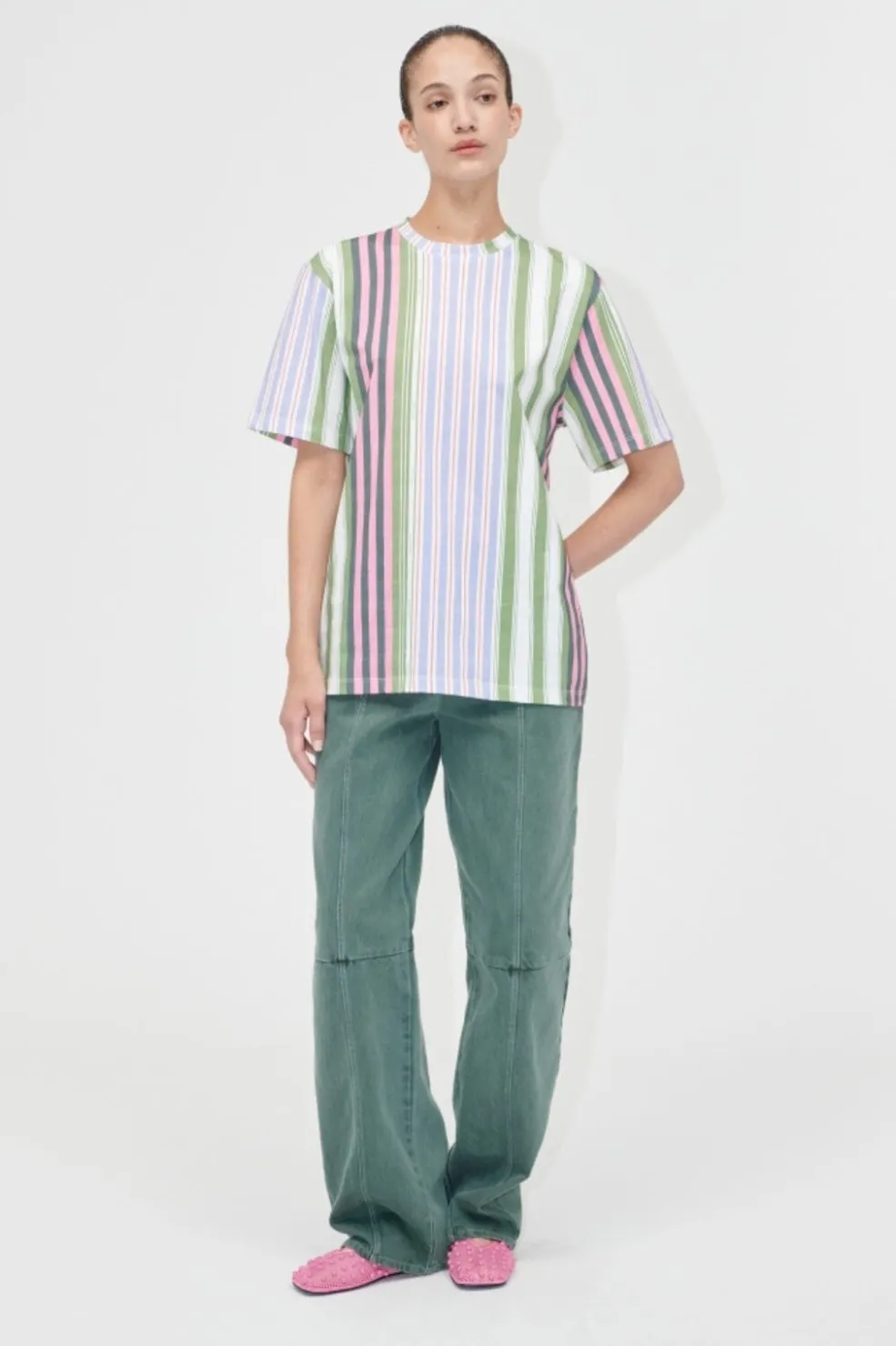 Stribet t-shirt fra Stine Goya med vertikale striber i grøn, pink, blå og hvid. T-shirten har en oversized pasform og rund hals, hvilket giver et afslappet look.