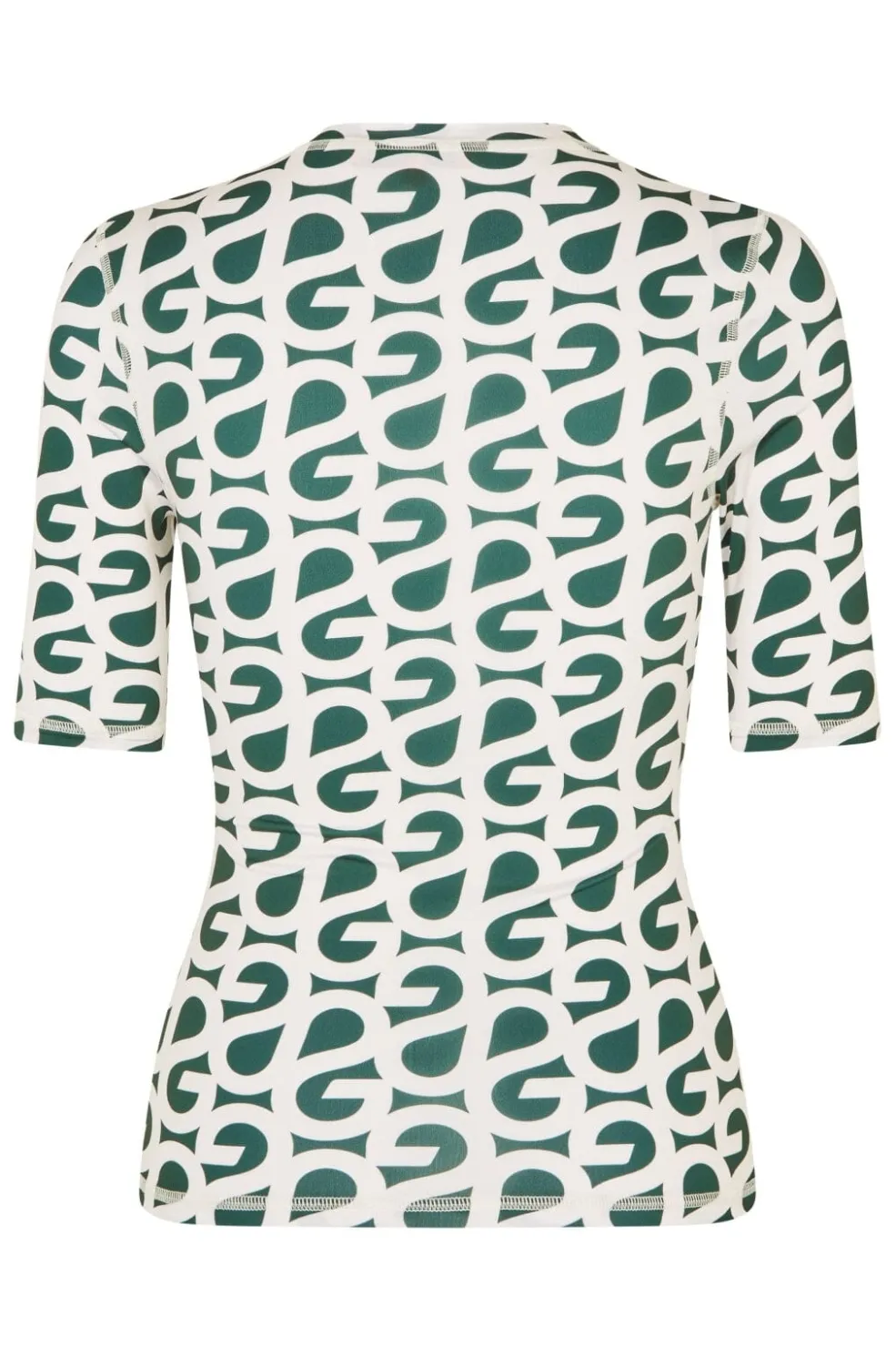 Skovgrøn t-shirt fra Stine Goya med korte ærmer og all-over logoprint i hvid. T-shirten har en høj hals og tætsiddende pasform, der følger kroppens form.