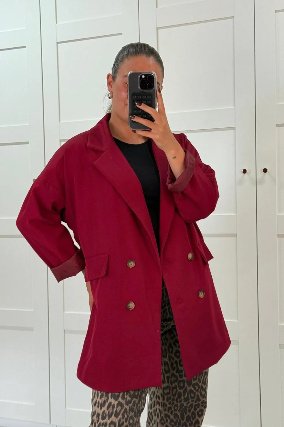 Blazer fra A-bee i en dyb burgundy-farve. Den har en oversized pasform og lange ærmer med dobbeltknaplukning foran.