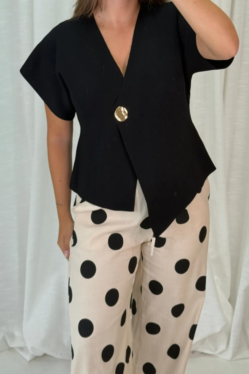 Sort top fra A-bee med asymmetrisk design, stor dekorativ knap og korte, brede ærmer. Toppen har en V-udskæring og er lavet af viskose og polyamid.