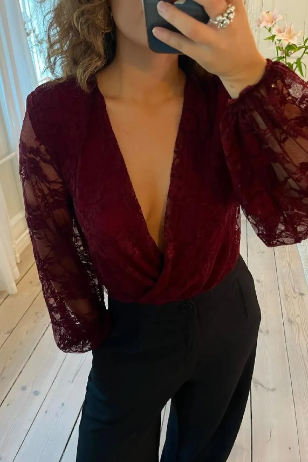En bodystocking fra A-bee i en dyb burgundy-farve. Bodystockingen har lange ærmer med blonde og et florale mønster.