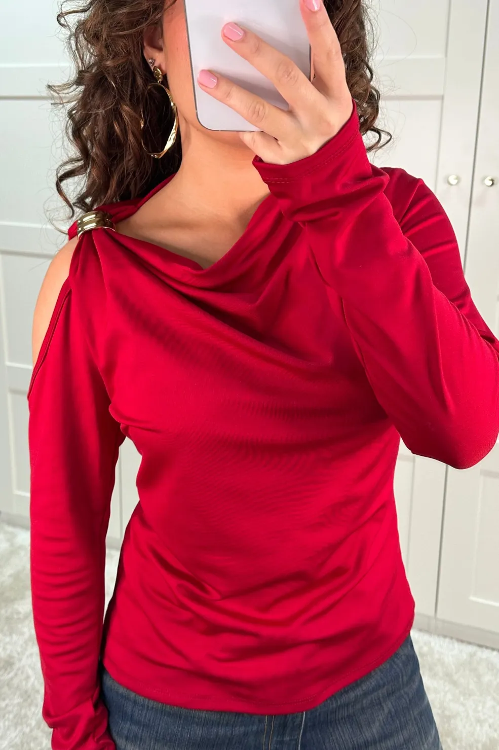 Bluse fra A-bee i en dyb bordeauxfarve. Blusen har off-shoulder-udskæring med et dekorativt guldspænde på skulderen.