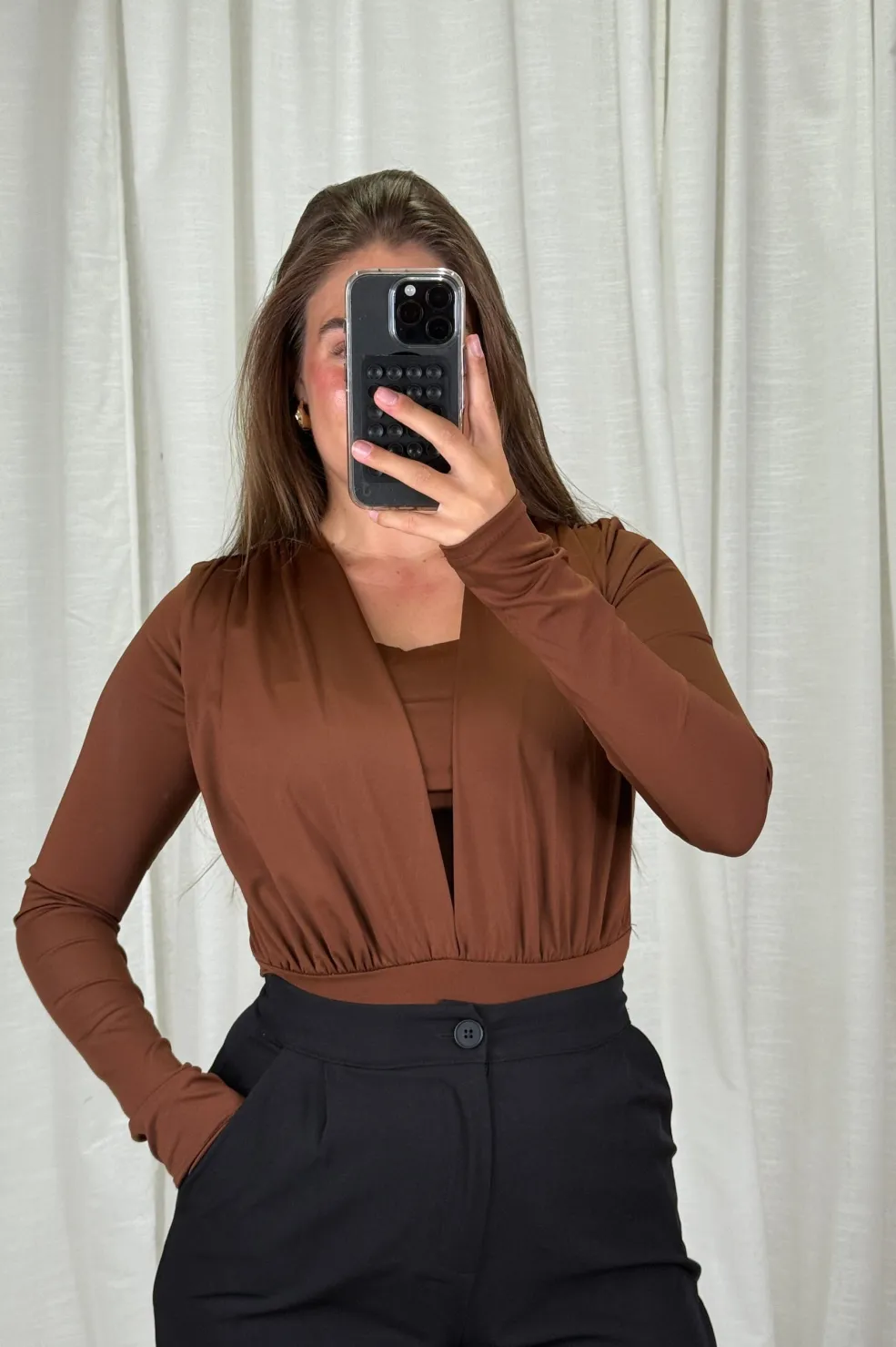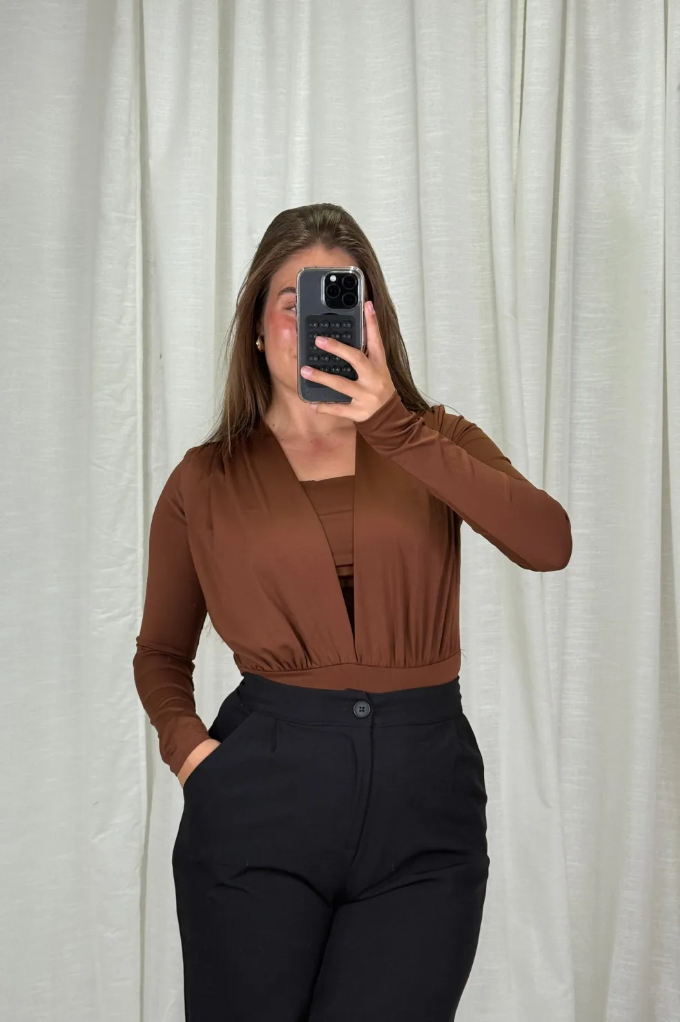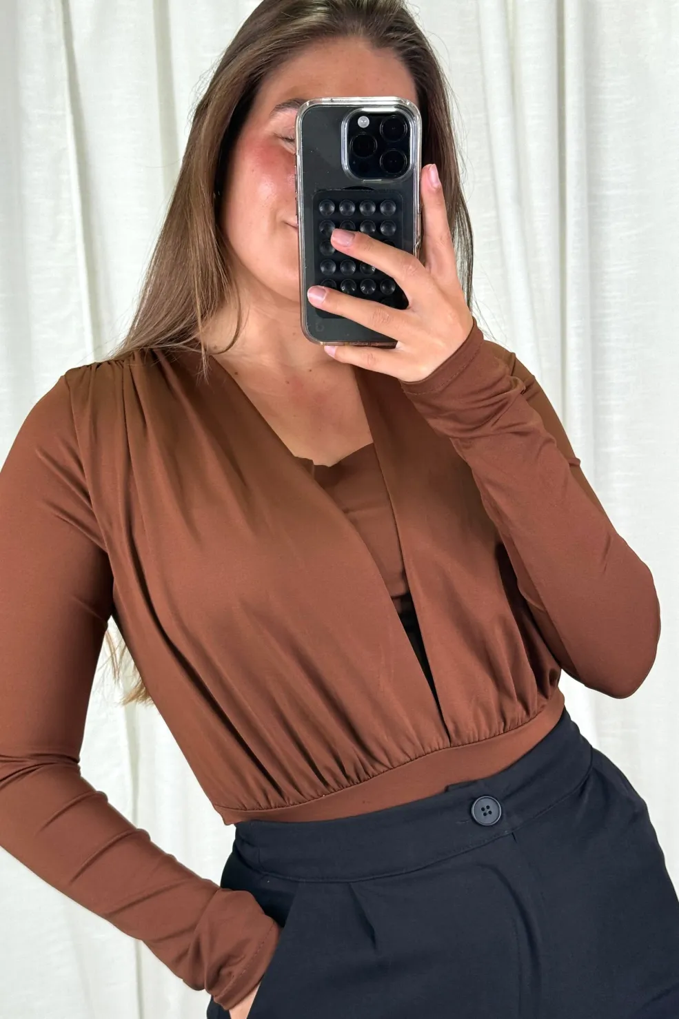 Brun bodystocking fra A-bee med lange ærmer og dyb V-udskæring. Bodystockingen har en slim fit-pasform og en elastisk talje.