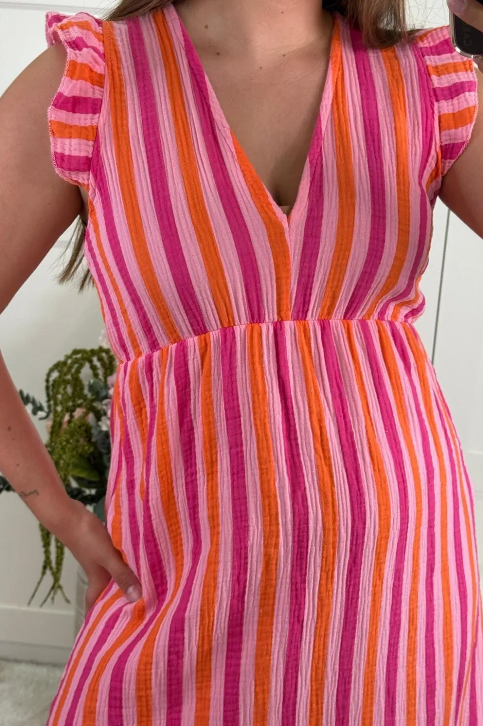 Stribet ankellang kjole fra A-bee i pink og orange. Kjolen har flæseærmer og V-udskæring. Den er lavet i et let og luftigt bomuldsstof med vertikale striber.