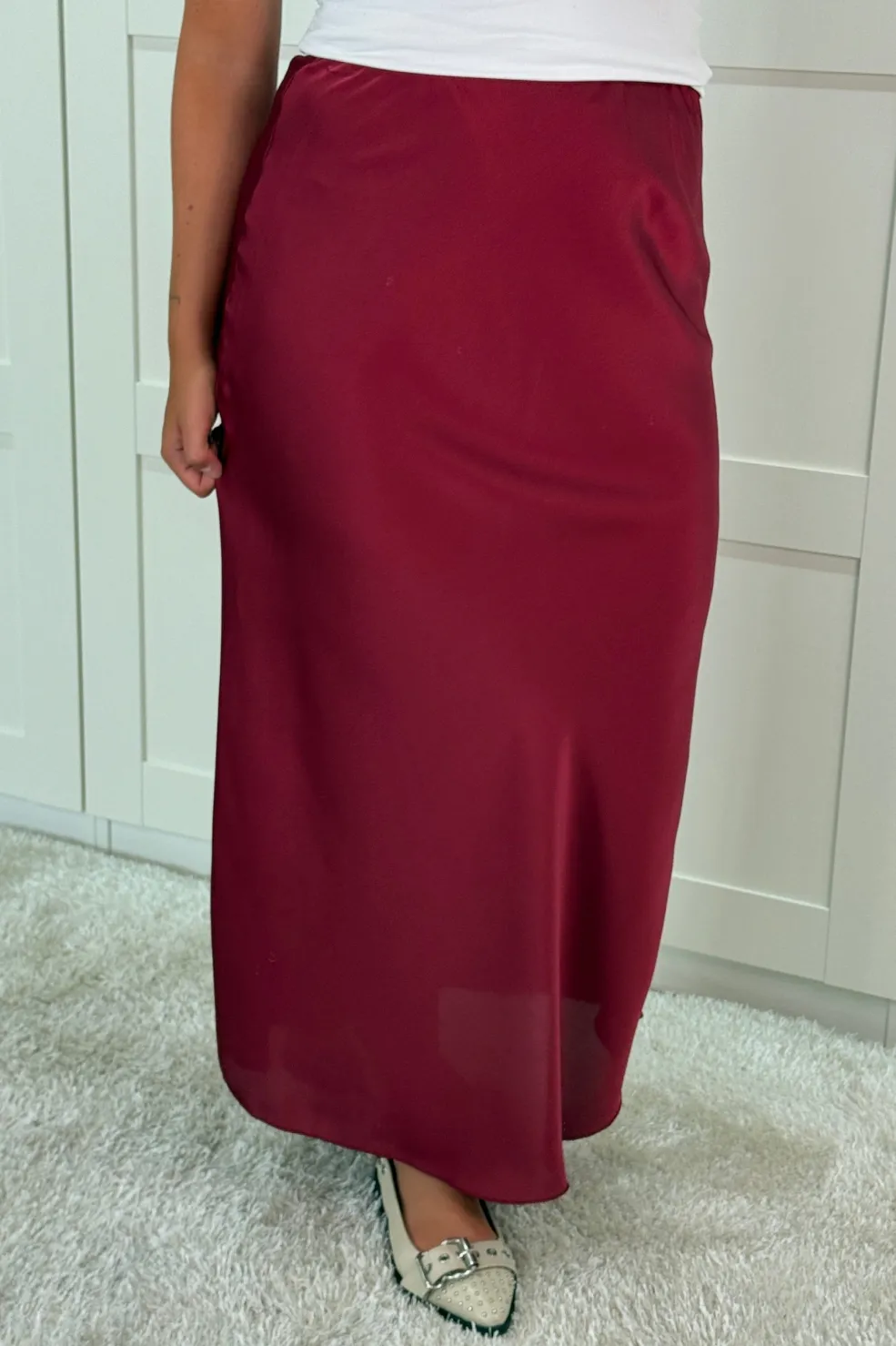 Bordeauxrød nederdel fra A-bee med ankel-længde og almindelig taljehøjde. Nederdelen har en ensfarvet overflade i en dyb rød nuance.