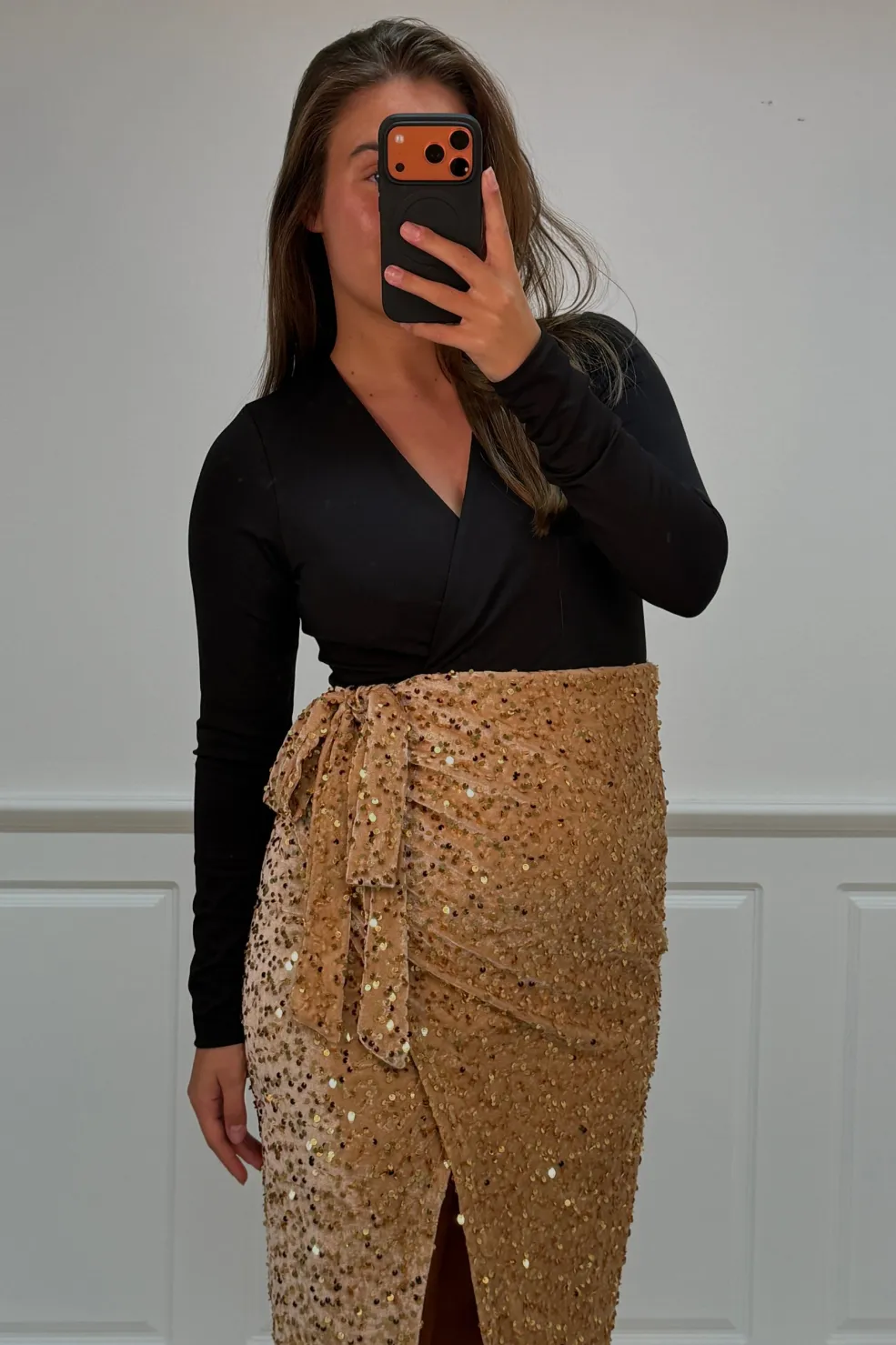 Festkjole fra A-bee med sort overdel og gylden nederdel. Kjolen har en tætsiddende pasform med V-udskæring og lange ærmer. Pailletterne på nederdelen giver et skinnende udtryk.