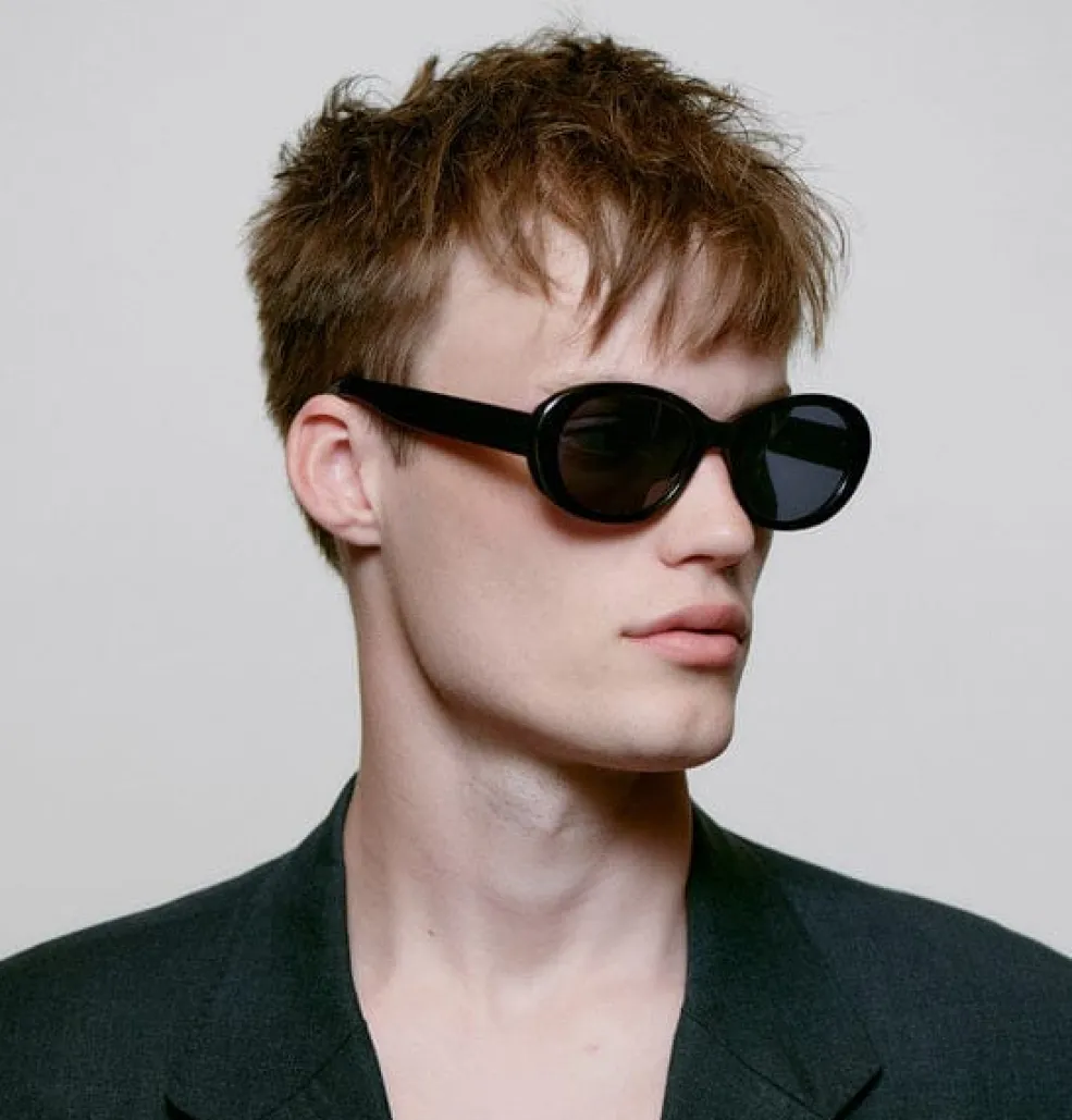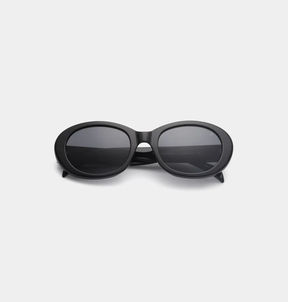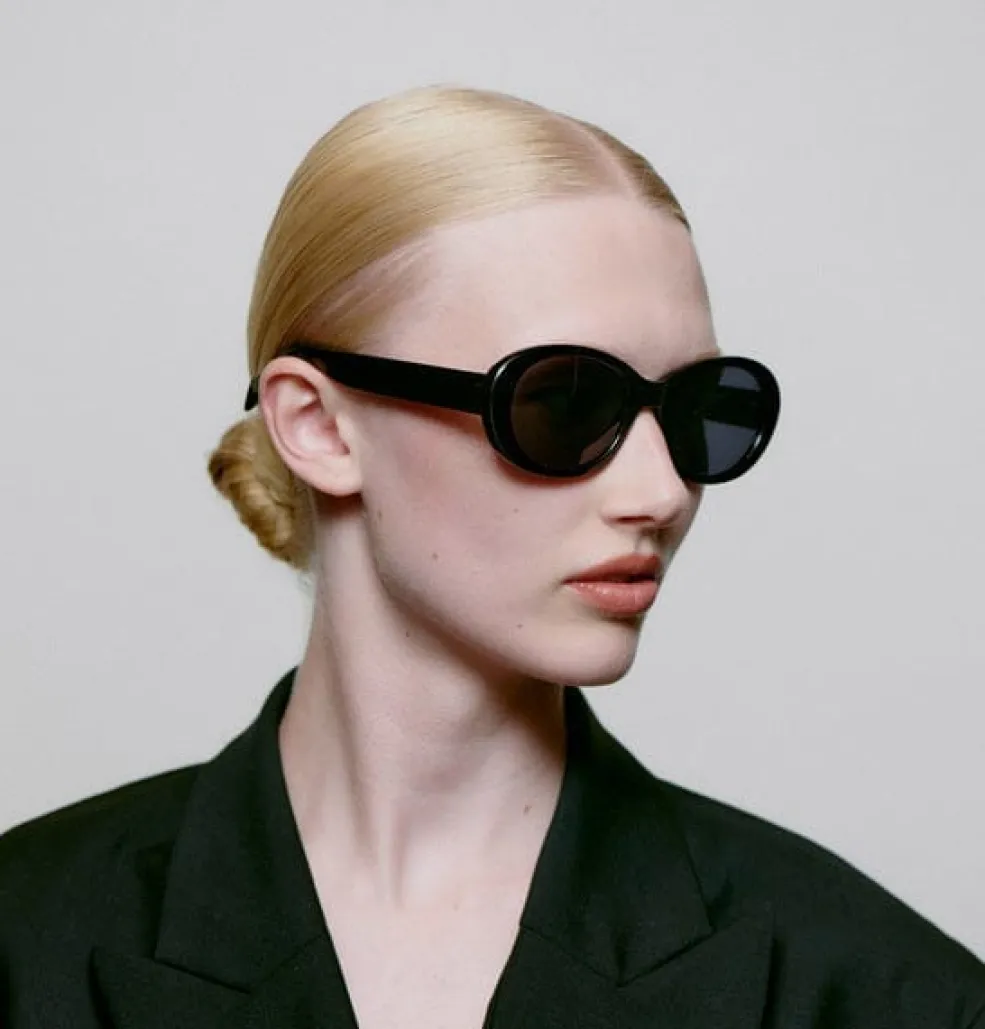 Sorte solbriller fra A. Kjærbede med oval ramme og kraftige sider. Stellet har en afrundet form med mørke glas og tyk kant, der giver god beskyttelse mod sidelys.