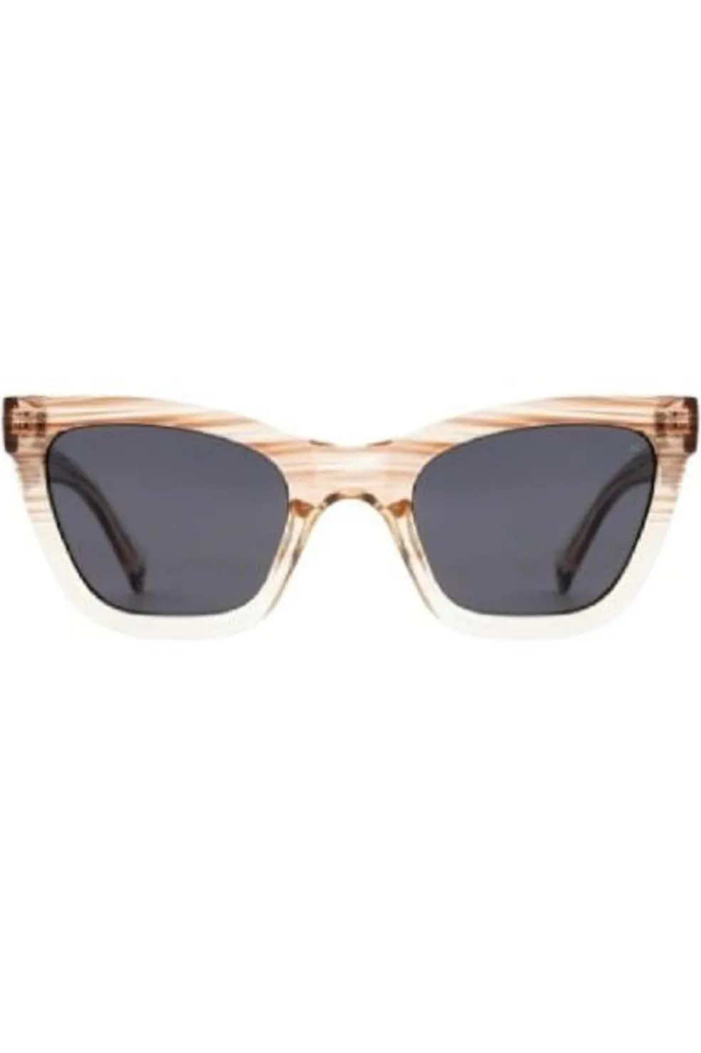 Solbriller fra A. Kjærbede med cat-eye-form og stribet stel i demi grå og krystalklar. Stellet har formbare brillestænger med metalkerner og UV 400-beskyttelse.