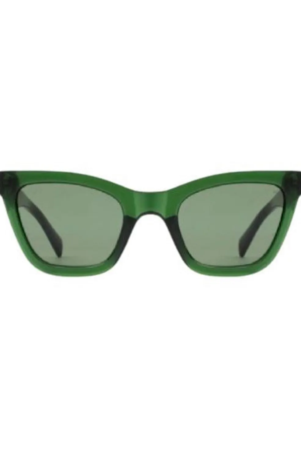 Solbriller fra A. Kjærbede med cat-eye-form i transparent mørkegrøn. Stellet er lavet af polycarbonat med UV400-beskyttelse og optiske hængsler af høj kvalitet.