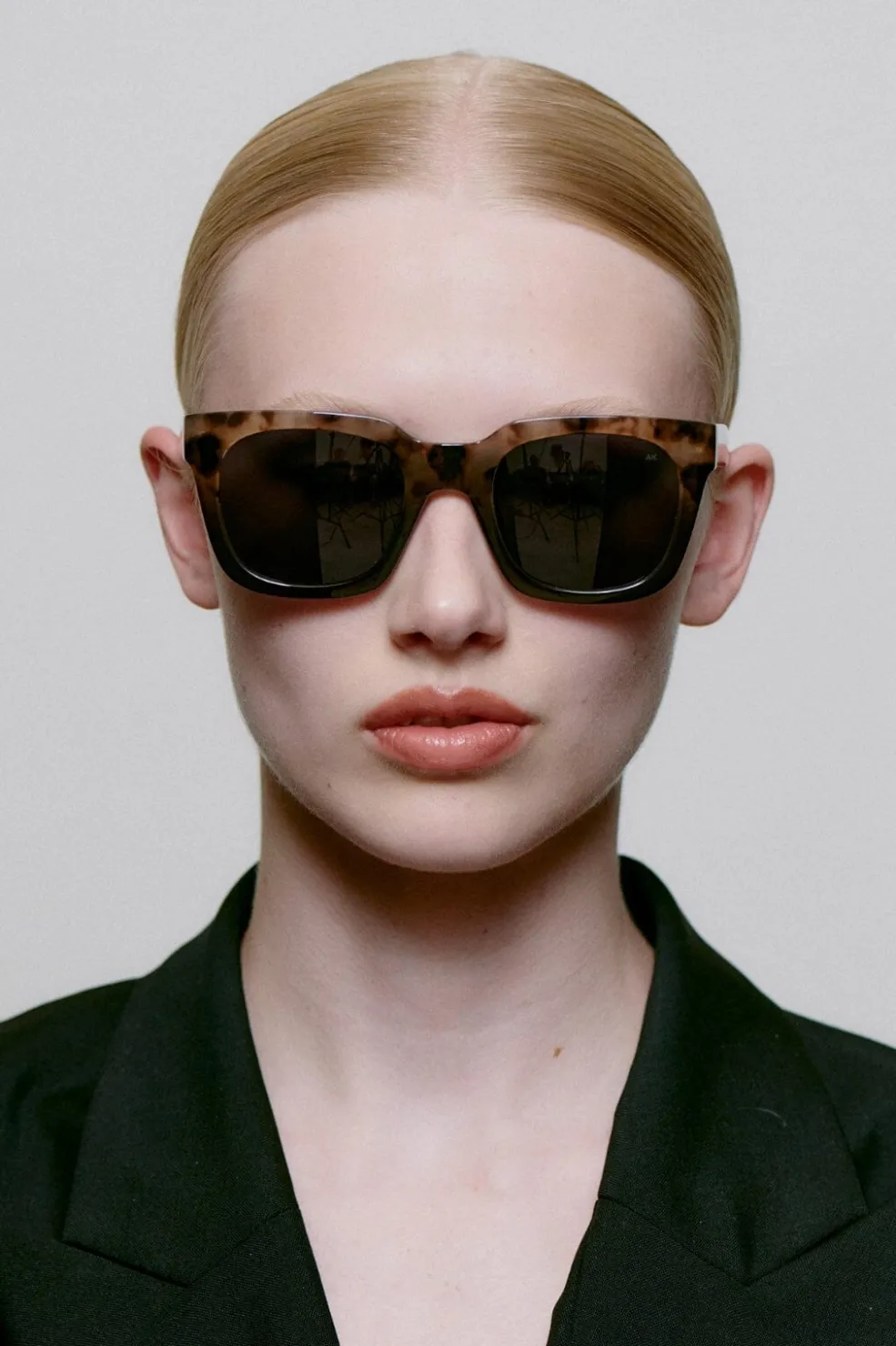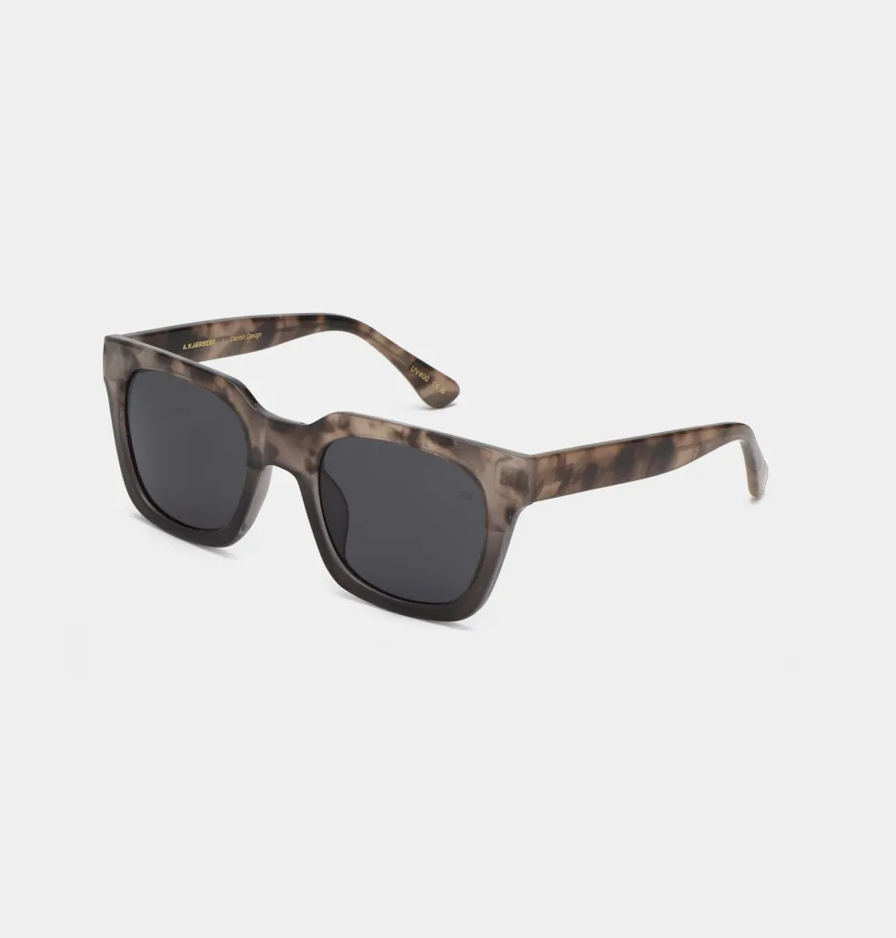 Firkantede solbriller fra A. Kjærbede med skildpaddemønstret stel i brun og grå transparent. Stellet har UV400-beskyttede polycarbonatlinser og justerbare stænger med metalkerne.
