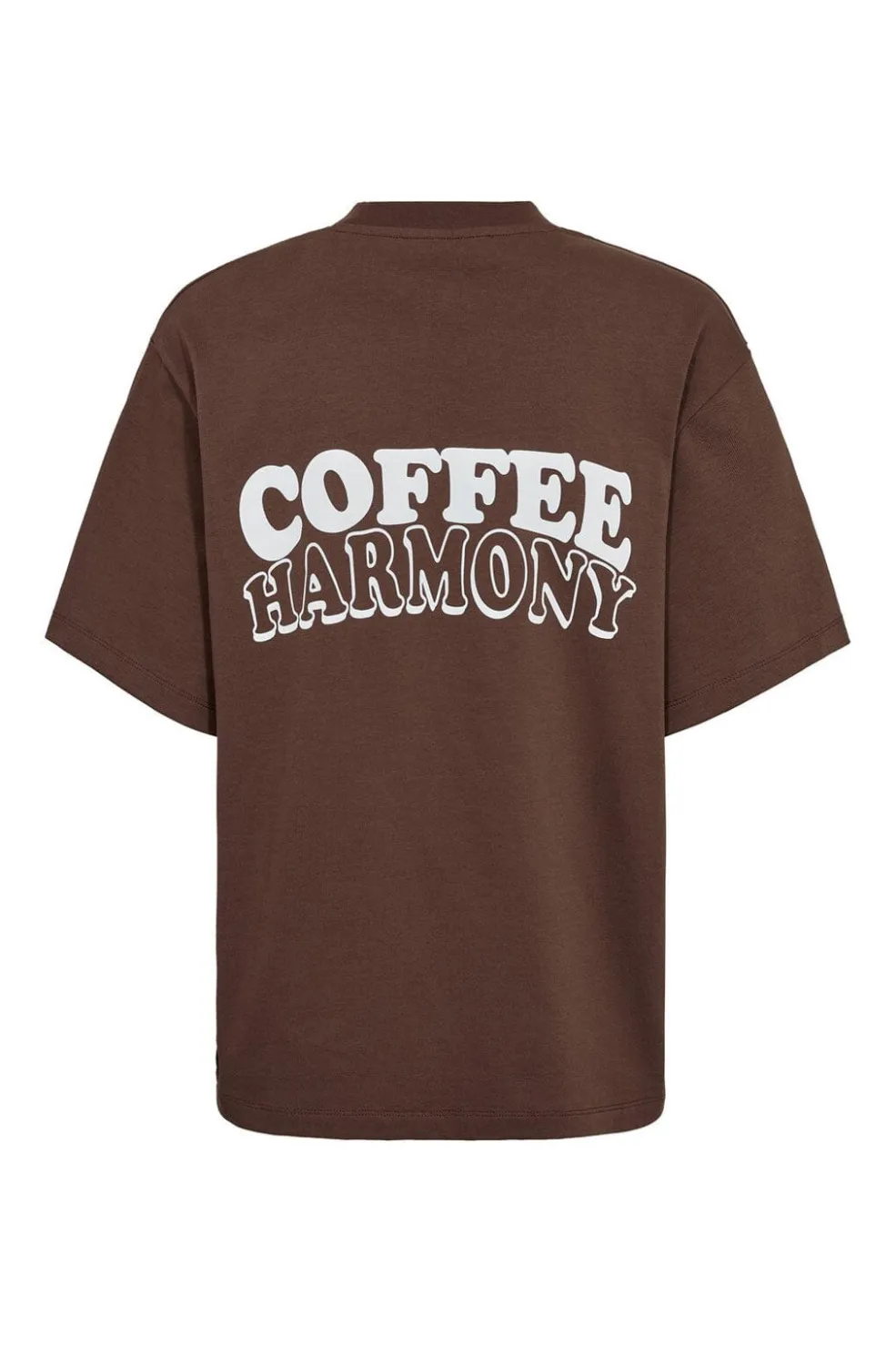 Brun t-shirt fra A-View med et stort COFFEE HARMONY-print på ryggen. T-shirten har en løs pasform og er lavet af økologisk bomuld med rund hals.