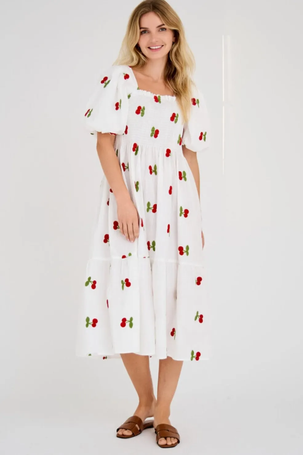 Hvid sommerkjole fra A-View med røde frugter på hvidt stof. Den smockede overdel og firkantede halsudskæring giver kjolen et feminint udtryk.