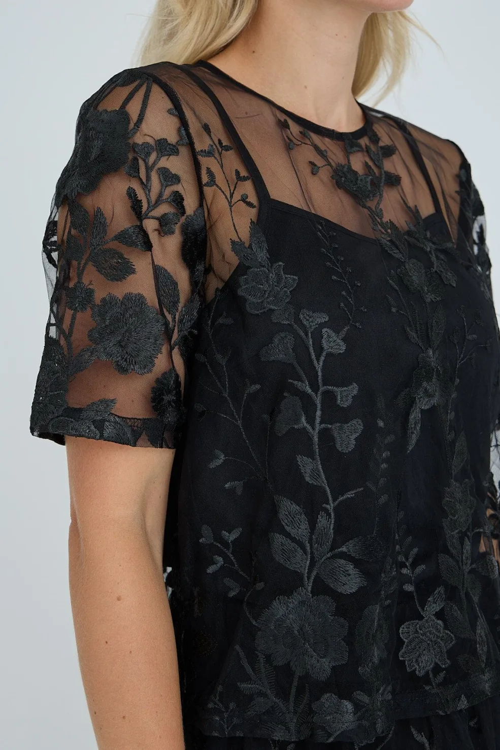 Sort bluse fra A-View, lavet af transparent mesh med broderede blomster. Blusen har korte, løse ærmer og en rund halsudskæring.