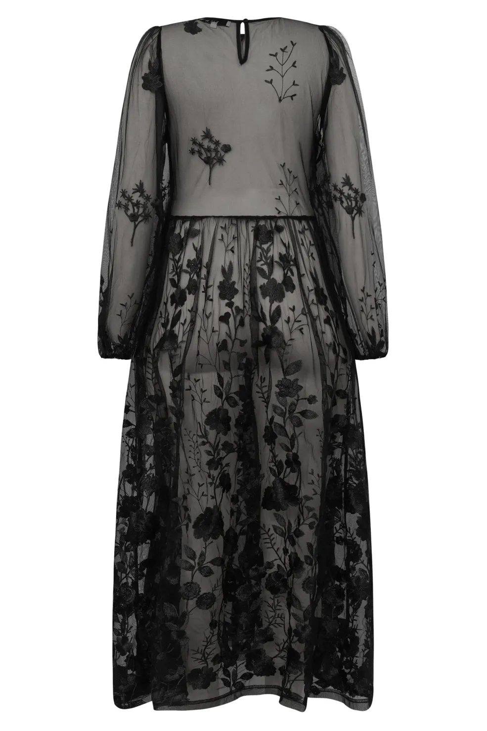 Sort kjole fra A-View, lavet af transparent mesh med broderede blomster. Kjolen er ankellang med en flydende nederdel.