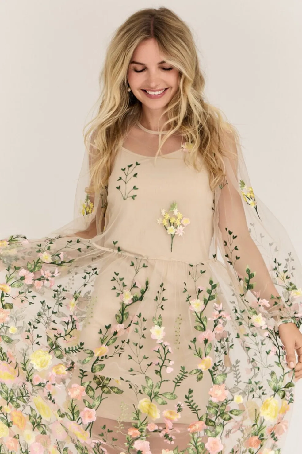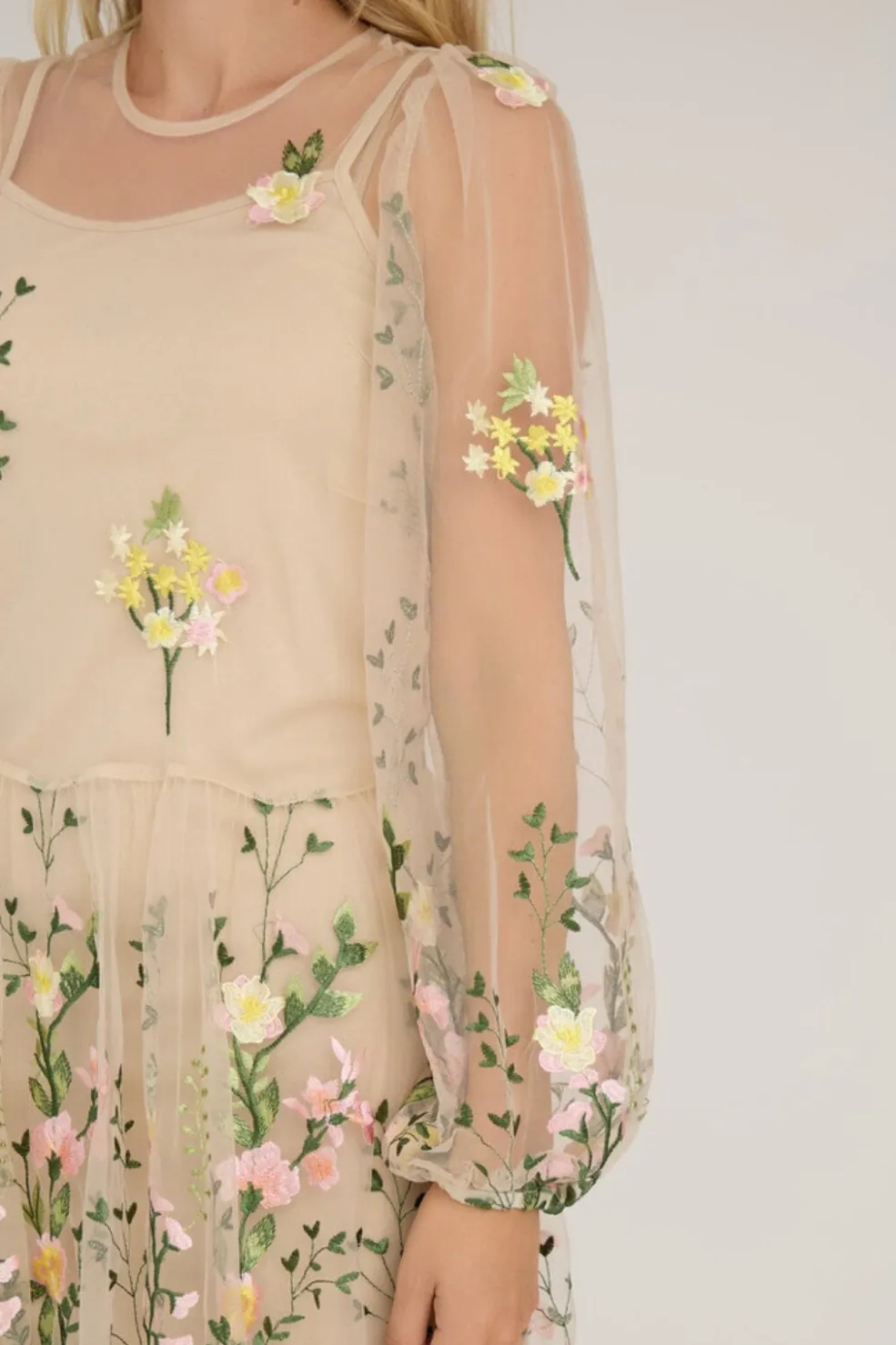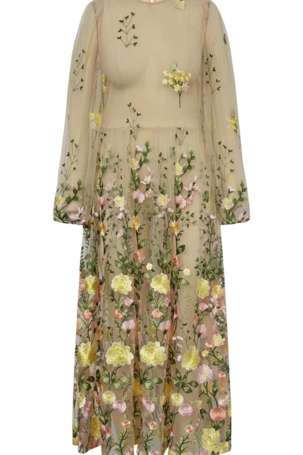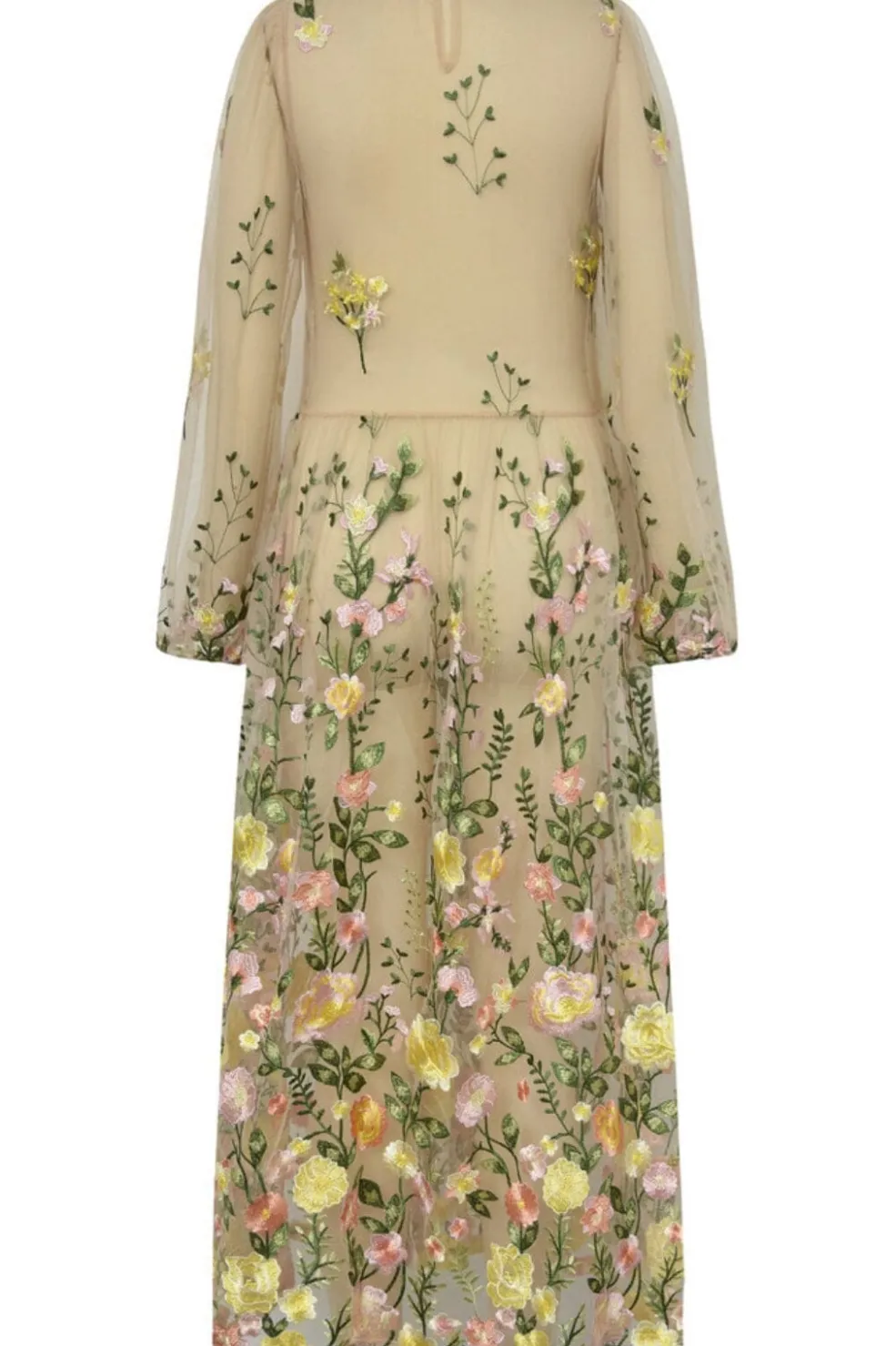 Sand/gul kjole fra A-View med broderede blomster i pink og gule nuancer. Den transparente mesh-kvalitet har lange ærmer med elastiske manchetter og en flydende nederdel i ankelængde.