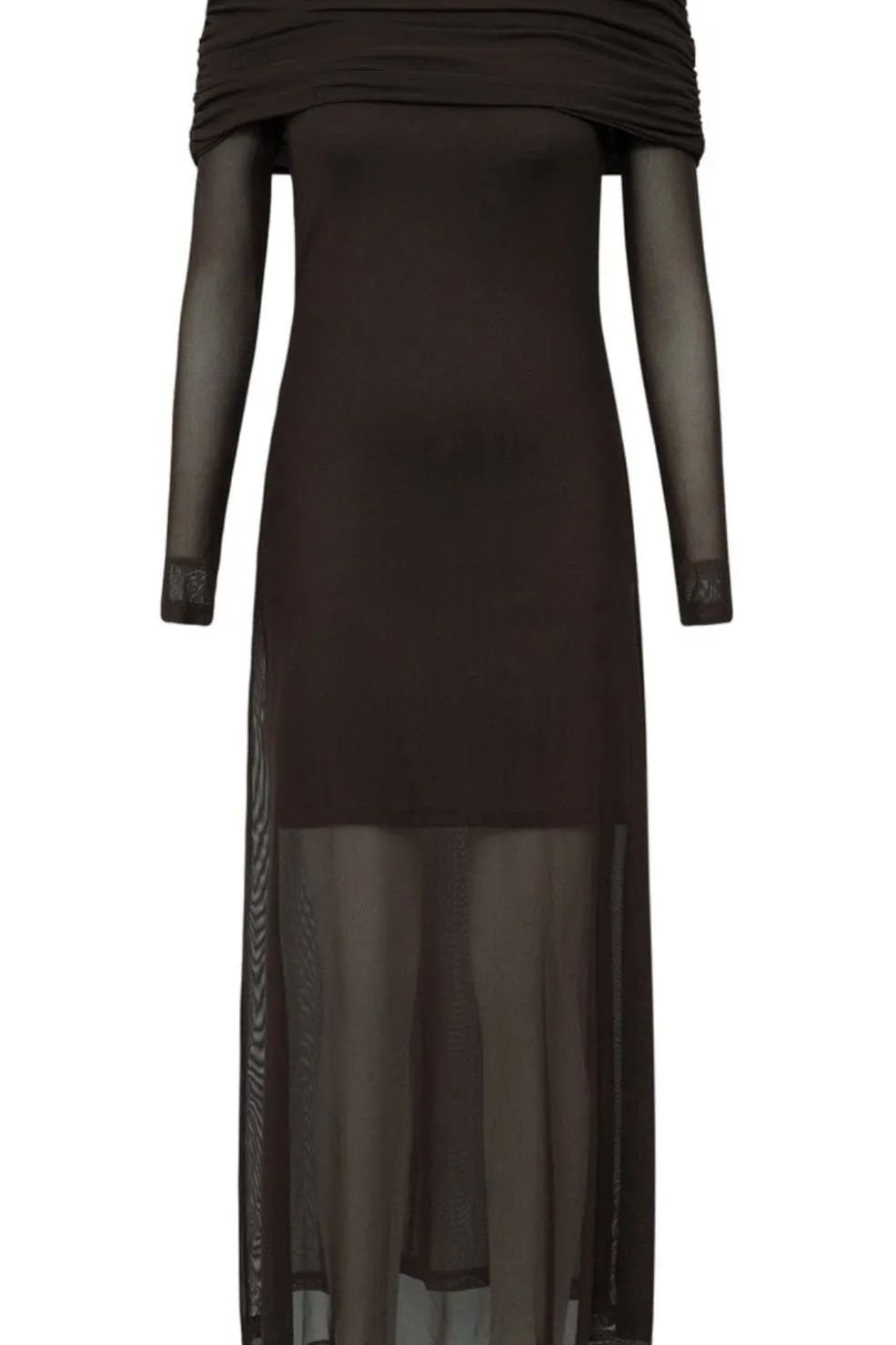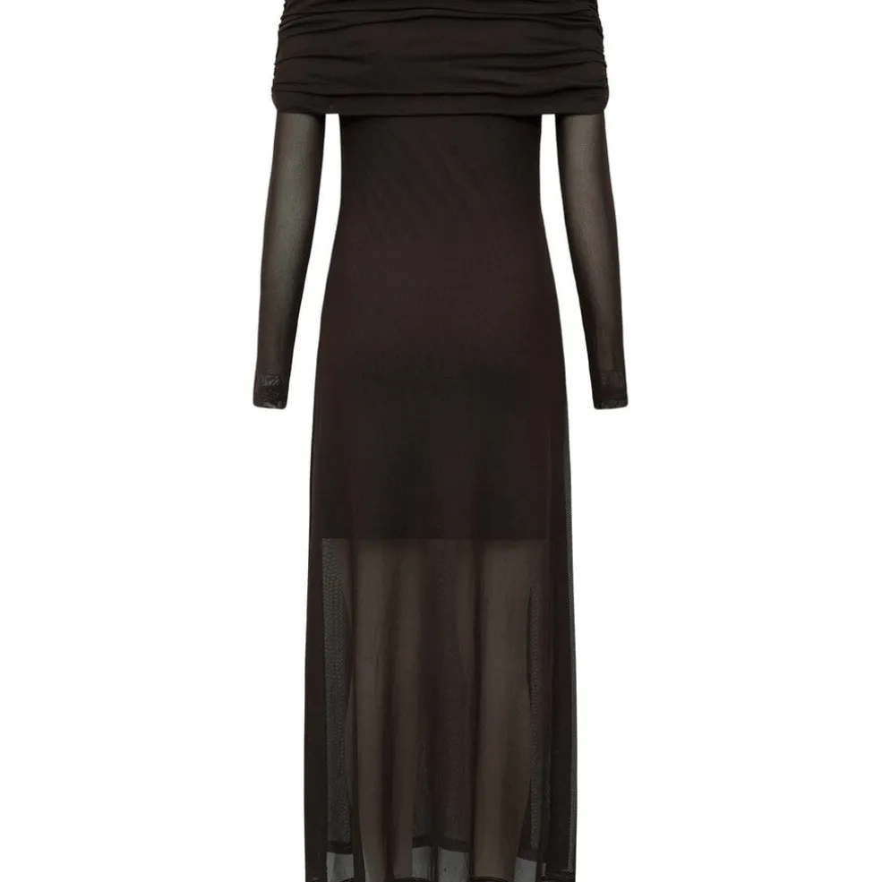 Mørkebrun kjole fra A-View med off-shoulder design og lange ærmer. Kjolen er lavet af 95% polyester og 5% elastan i en slank pasform.
