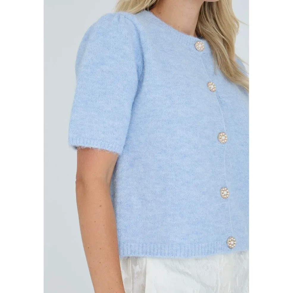 Strikket cardigan fra A-View i lyseblå. Cardiganen har korte ærmer og en knaplukning med perledetaljer.