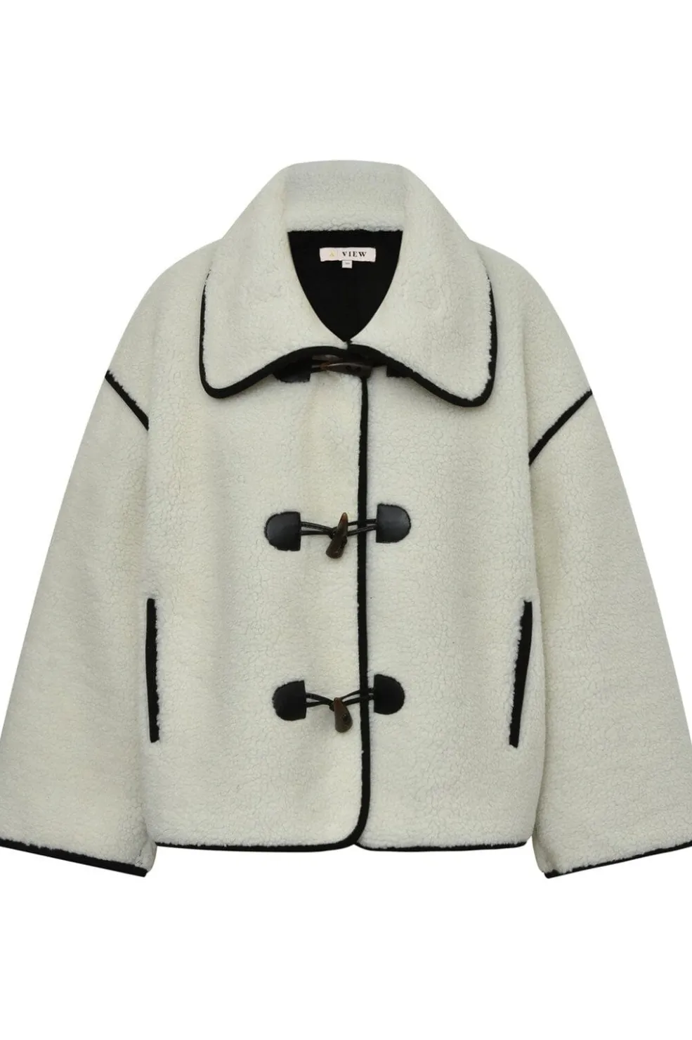 Kort jakke fra A-View i blød teddy-kvalitet. Den camelfarvede jakke har karakteristiske horn-toggles og sorte kontrastsyninger langs kanterne. Den høje krave og loose fit gør den praktisk til hverdagsbrug.