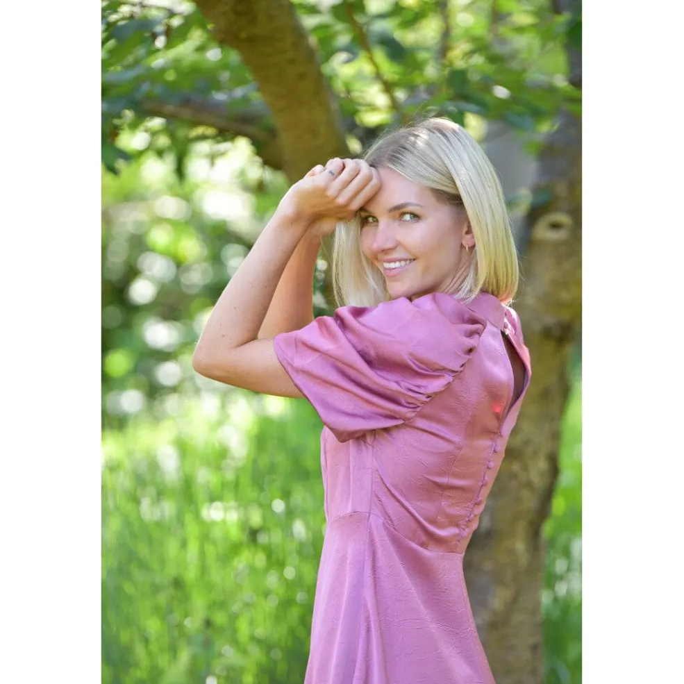 Rosa kjole fra A-View i ankellængde. Kjolen har voluminøse, korte ærmer og en høj halsudskæring.