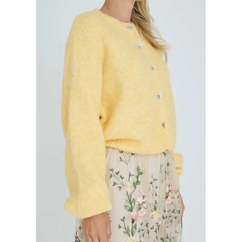 Lys gul cardigan fra A-View i blød strik. Den har knapper foran, lange ærmer og en løs pasform.