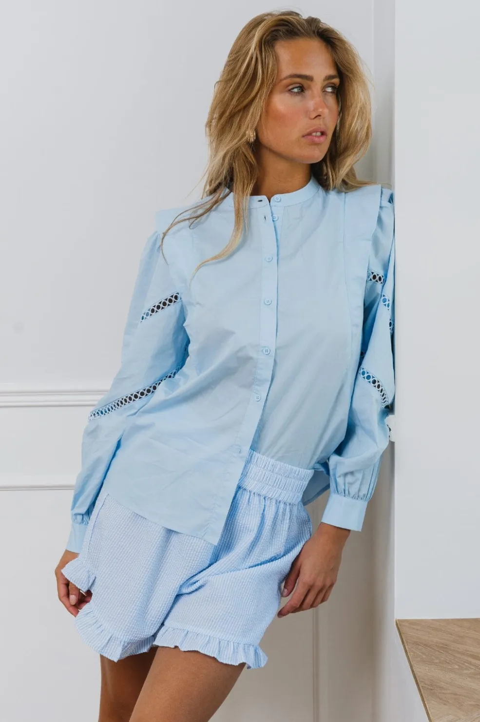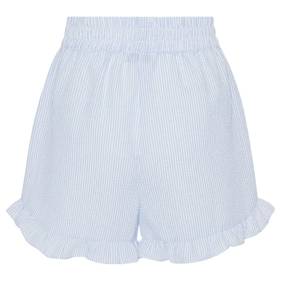 Stribede shorts i blå og hvid med flæsekant forneden. Den løse pasform og den elastiske talje giver god bevægelsesfrihed. Shortsene har et maritimt udtryk med deres blå og hvide striber.