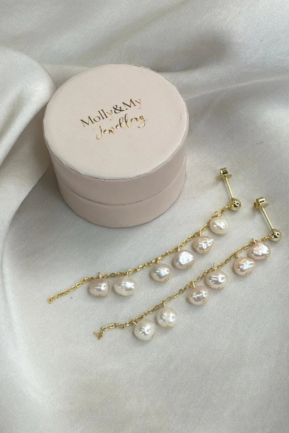 Forgyldte øreringe fra Molly&My Jewellery med hvide ferskvandsperler. Øreringene har en guldfarvet kæde med flere uregelmæssigt formede perler.