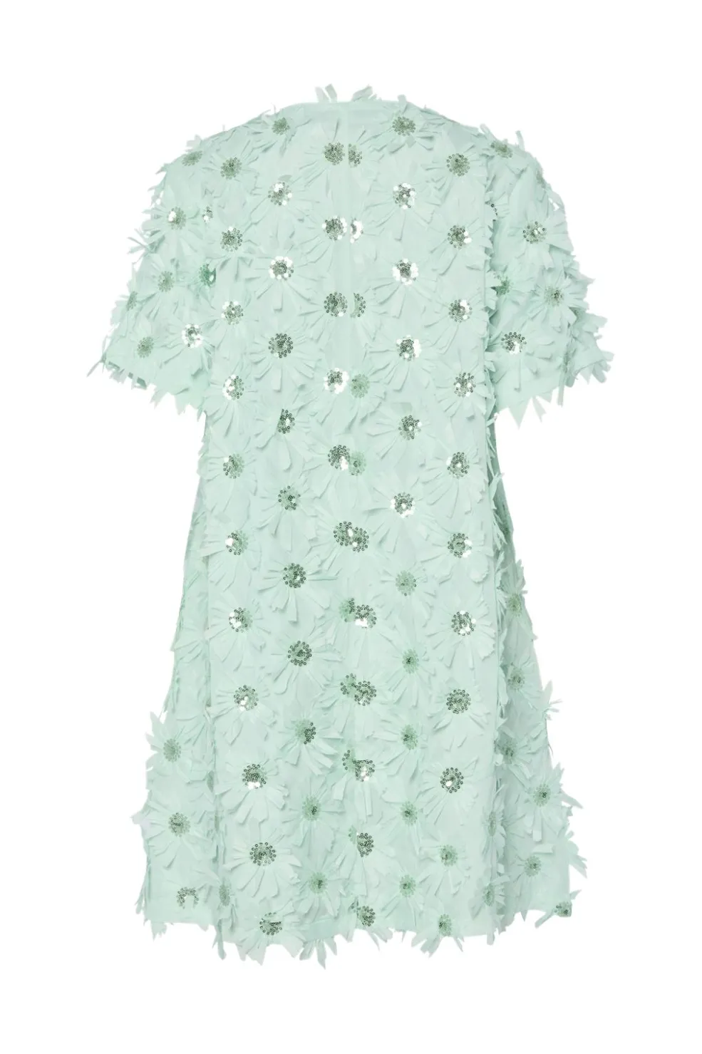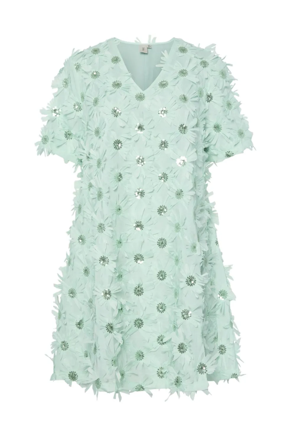 Mintgrøn kjole fra Y. A.S med blomstermønster og pailletter. Kjolen har V-udskæring og korte ærmer med et regulært fit, der følger kroppens naturlige linjer.