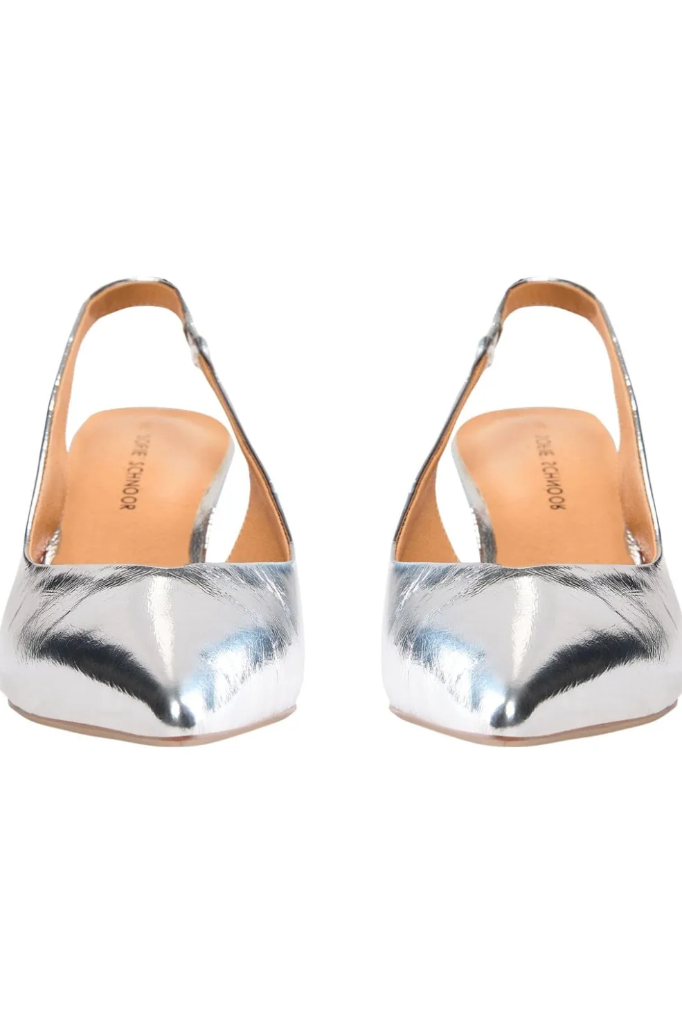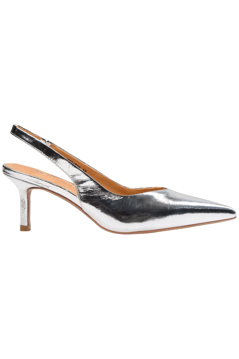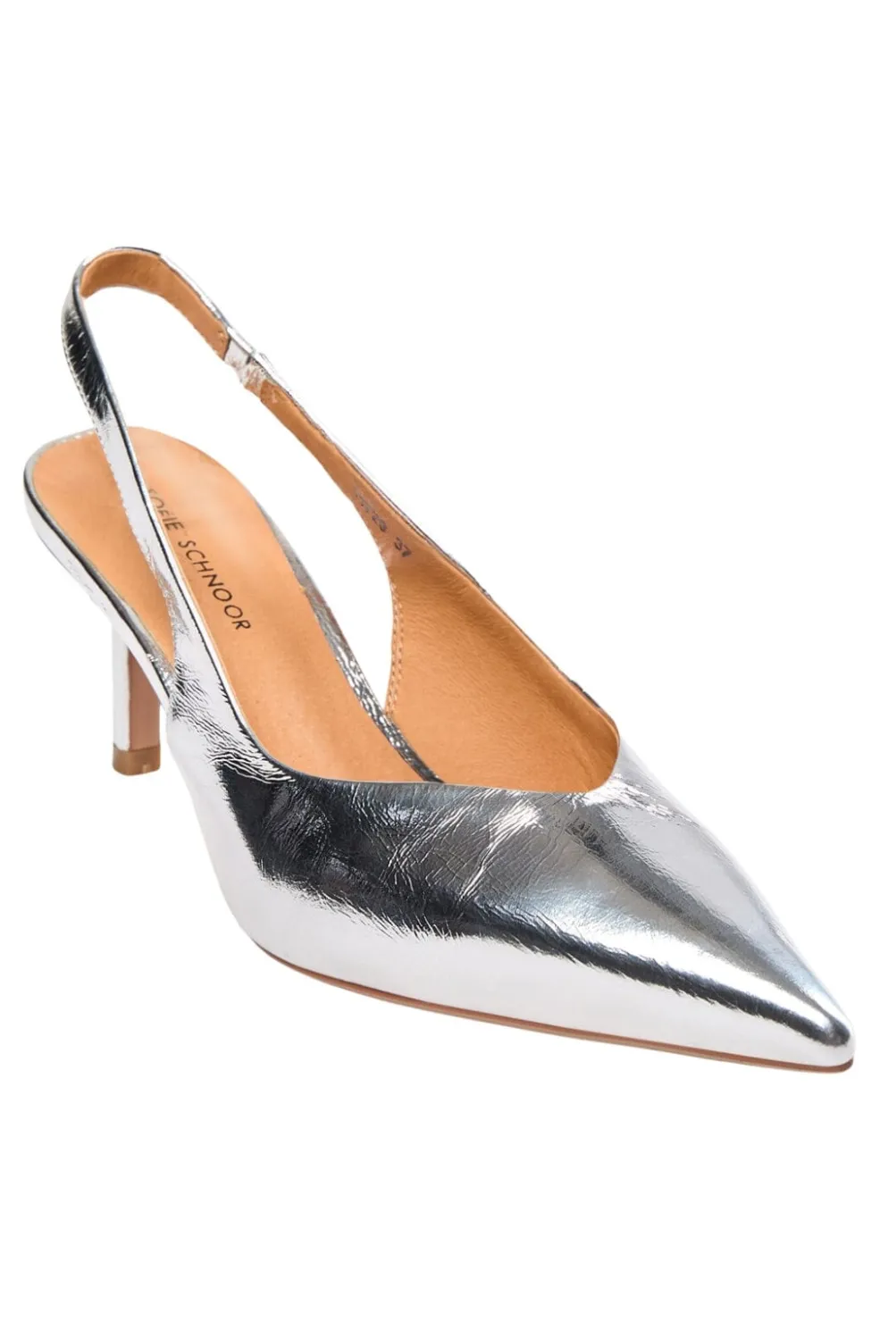 Slingback-sko fra Sofie Schnoor i sølvfarvet læder. Skoen har en spids tå og en lav hæl. Den metalliske overflade giver skoen et skinnende udtryk.