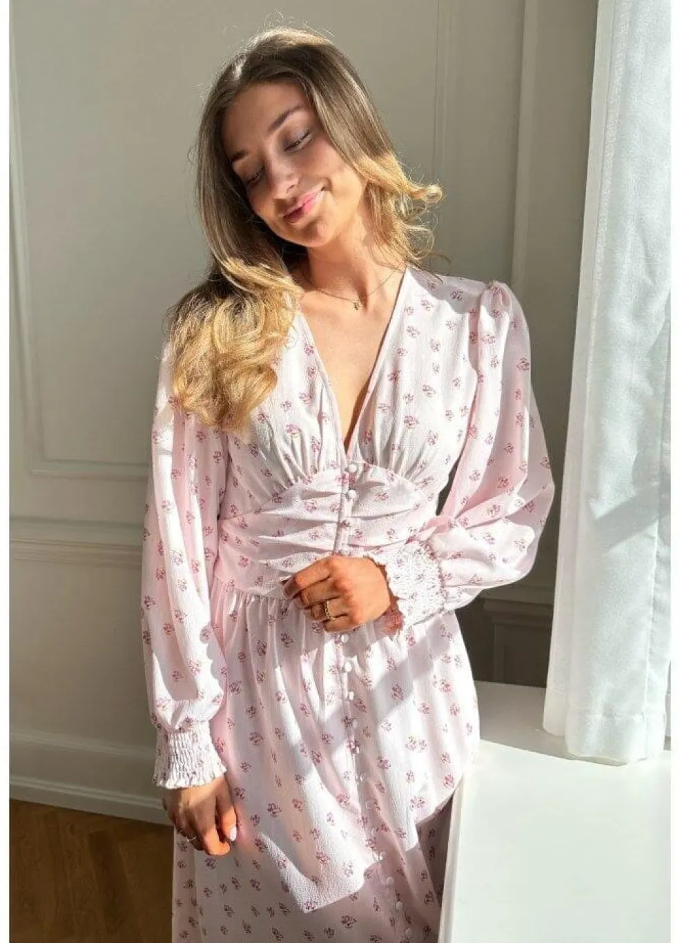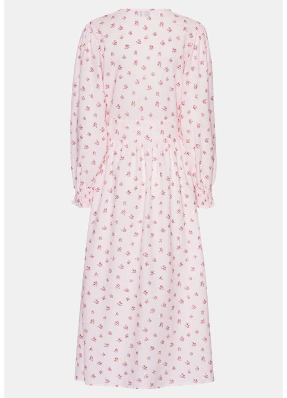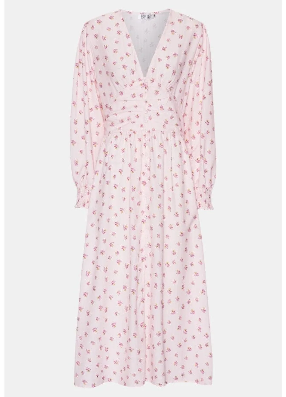 Lang kjole fra BYIC i pink med mørke rosenblomster. Kjolen har v-udskæring og en feminin pasform omkring taljen. Den er lille i størrelsen – vælg en størrelse større.