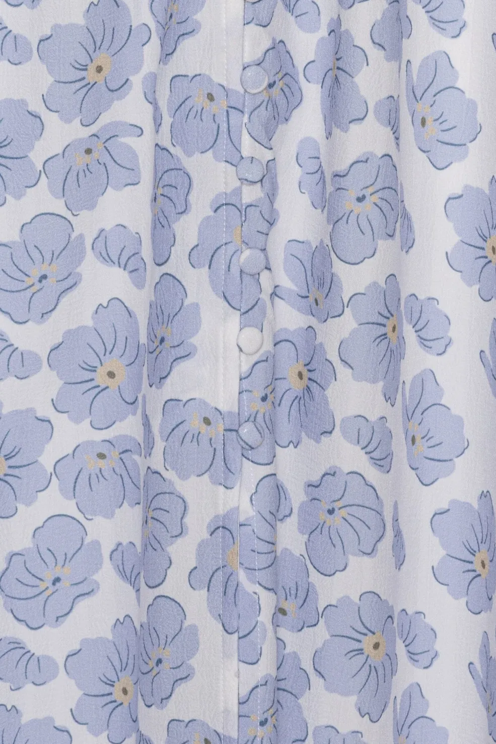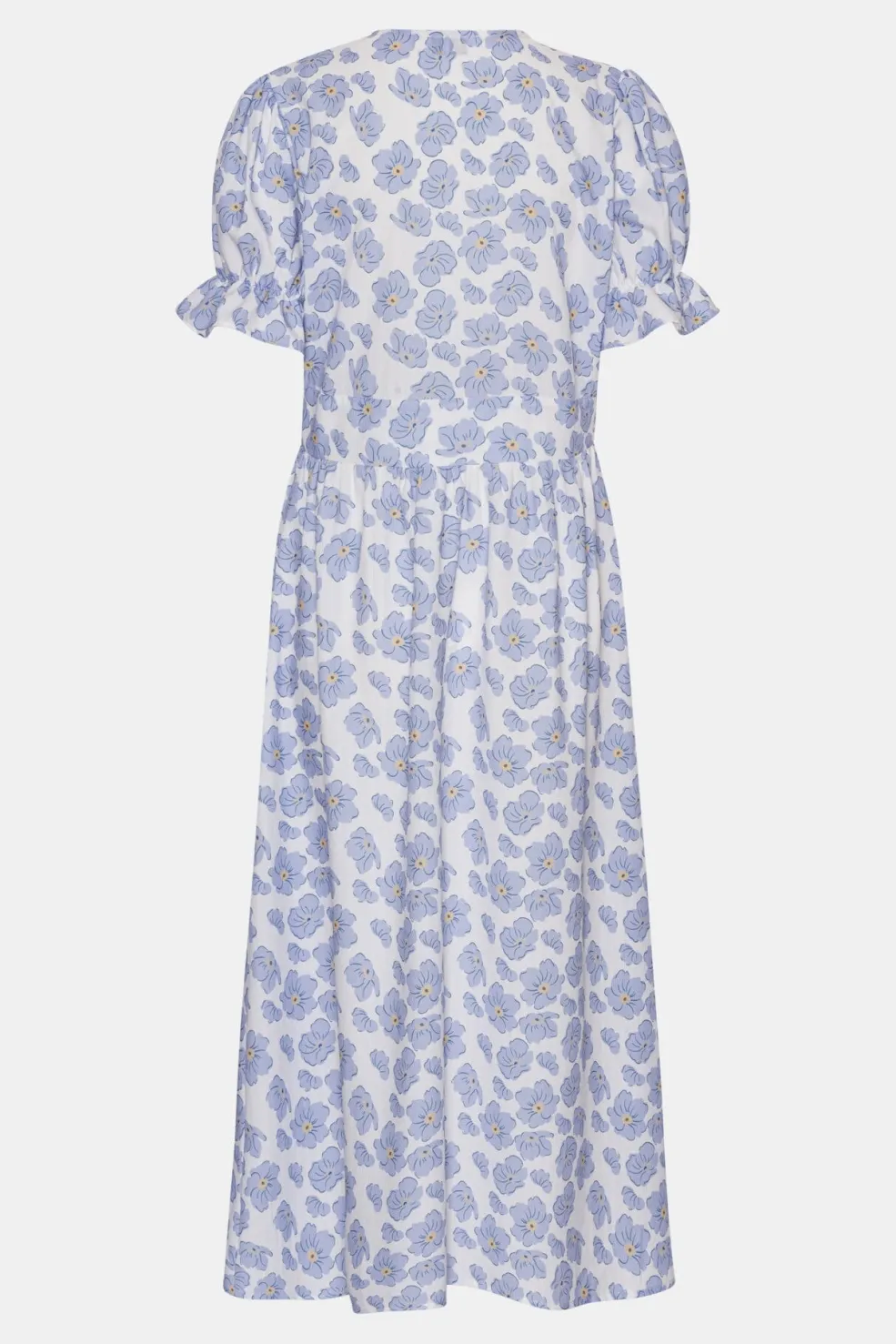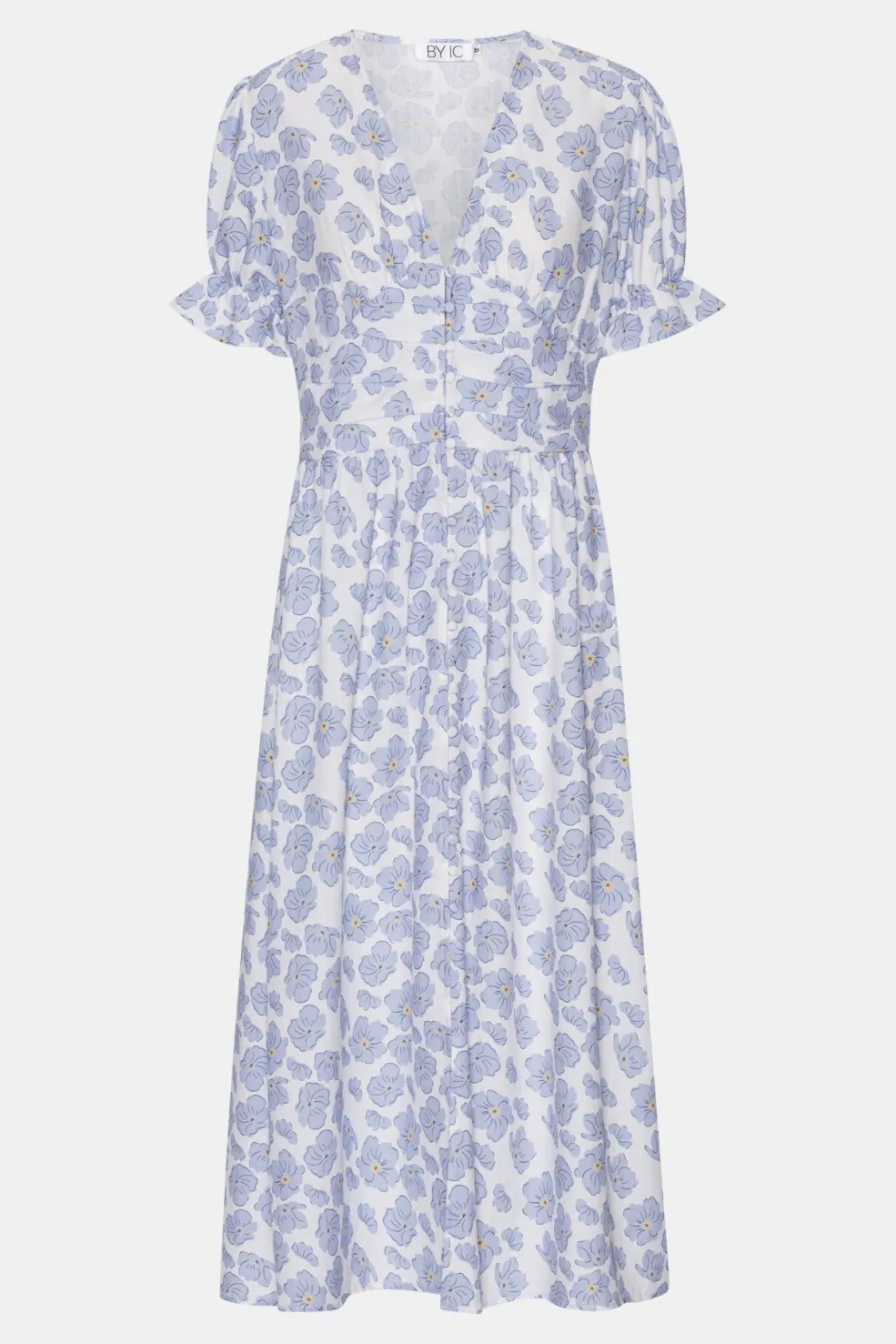 Lang kjole fra BYIC i hvid med blå blomster. Kjolen har v-udskæring, korte pufærmer og knaplukning foran. Den indsnævrede talje og flæsedetaljer giver kjolen en feminin form.