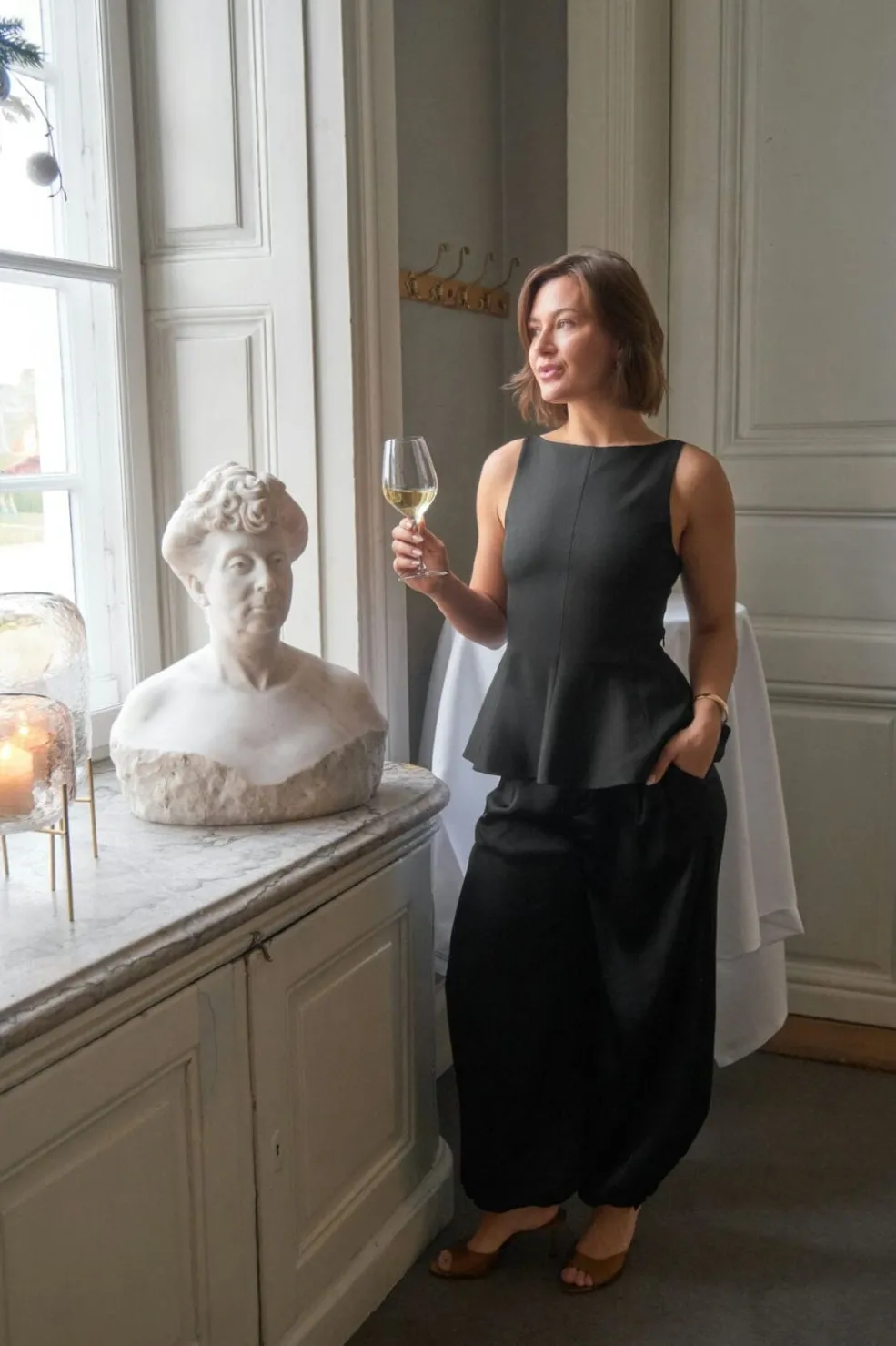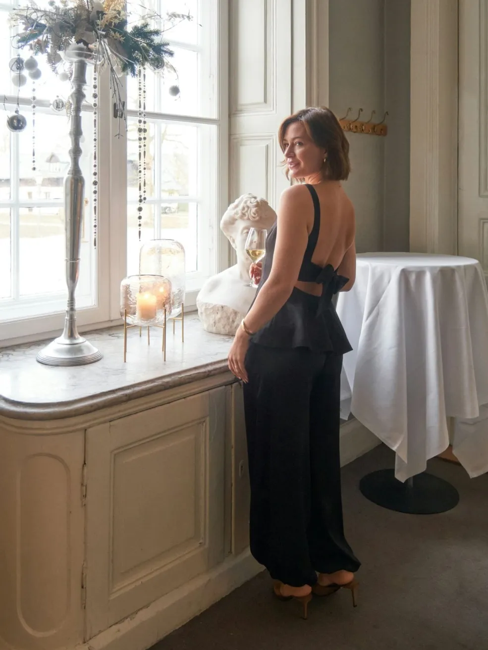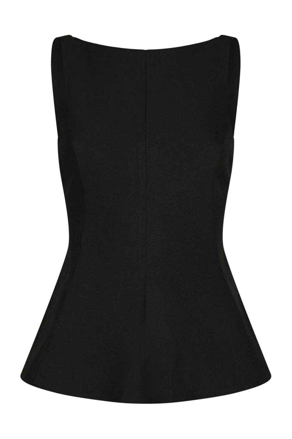 Sort top fra Neo Noir med firkantet halsudskæring. Toppen har en tætsiddende pasform med vidde forneden og bindes med en sløjfe på ryggen.