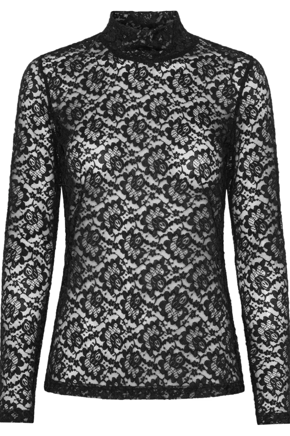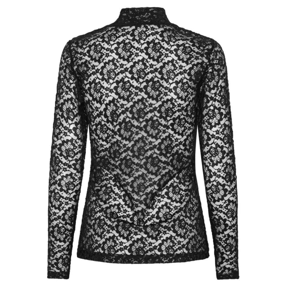 Sort blondetop fra Continue med blomstermønster. Toppen har en høj halsudskæring og lange ærmer i en kropsnær pasform.