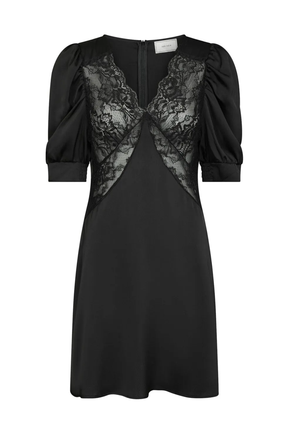 Sort kjole fra Neo Noir i satin med blondedetaljer på forsiden. Den har en v-halsudskæring og korte pufærmer samt lynlås i ryggen.