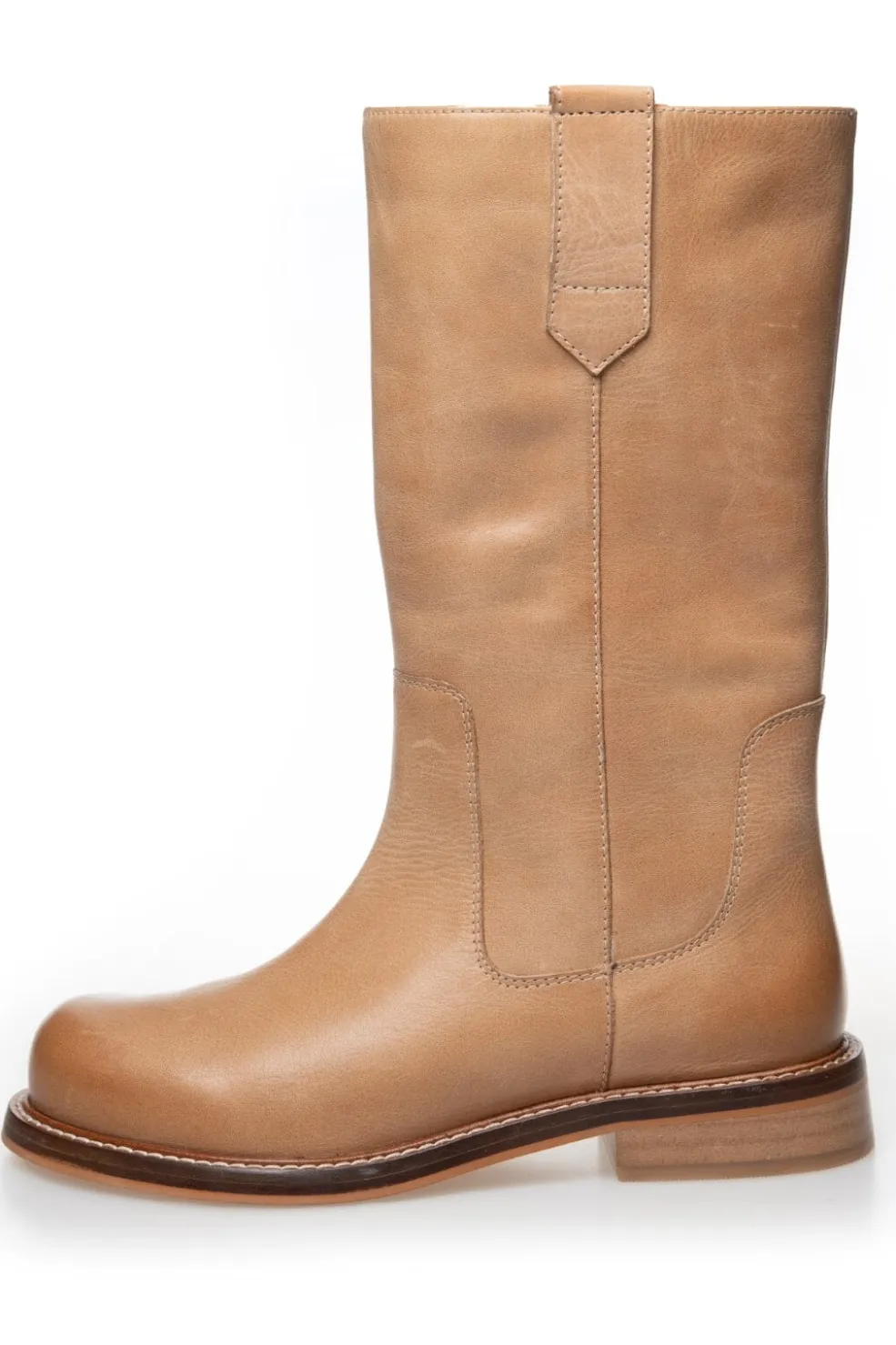 Mellemlang støvle i lysebrunt læder. Støvlen har rund tå, lav hæl og lynlås på indersiden. Materiale: Læder Sål: Neolite Skafthøjde: 31 cm målt på siden af en str. 37 Skaftomkreds: 38 cm målt ved øverste kant på en str. 37 Hæl: 3 cm Indersål: Læder og med 4-6 mm Copenhagen shoes foam