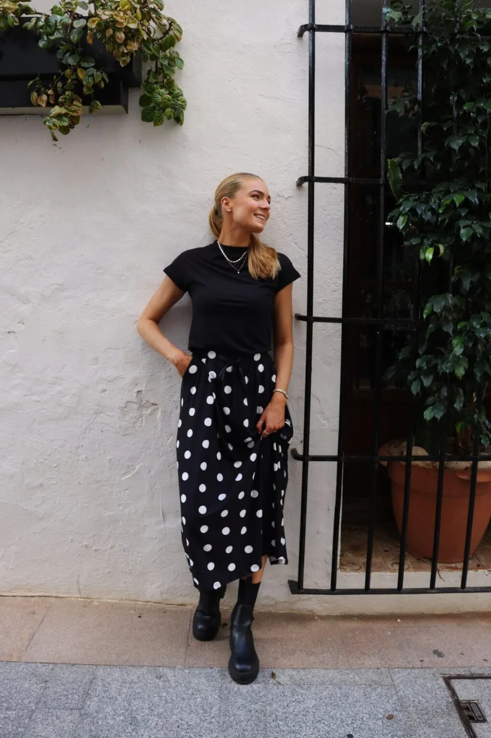 Sort nederdel fra Liberte med store hvide prikker. Den løse pasform og længden til midt på læggen gør den velegnet til afslappet brug.
