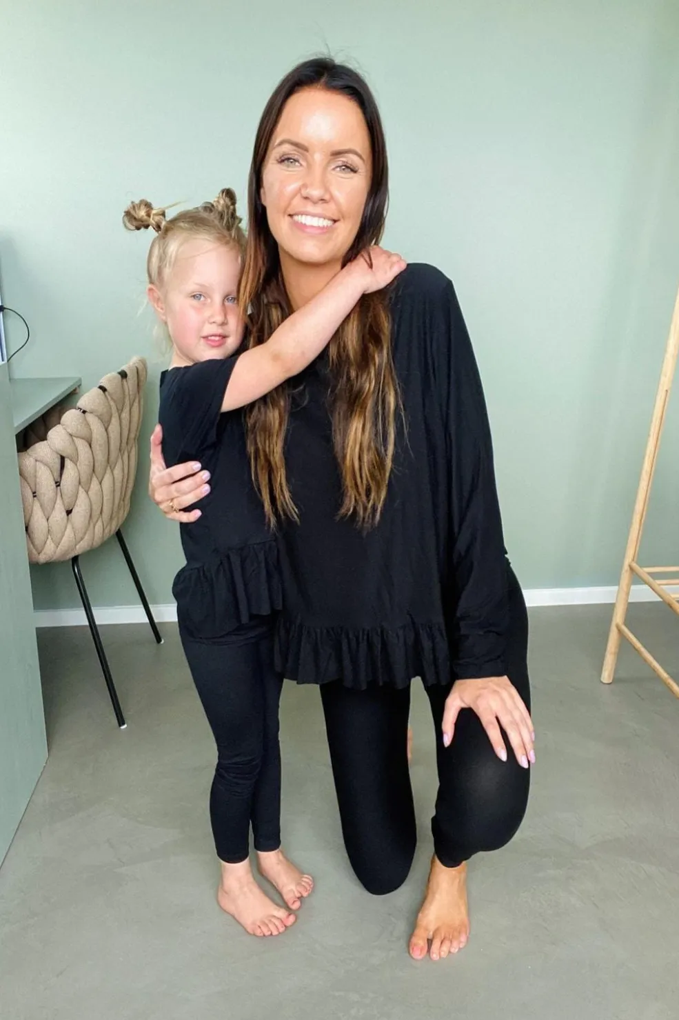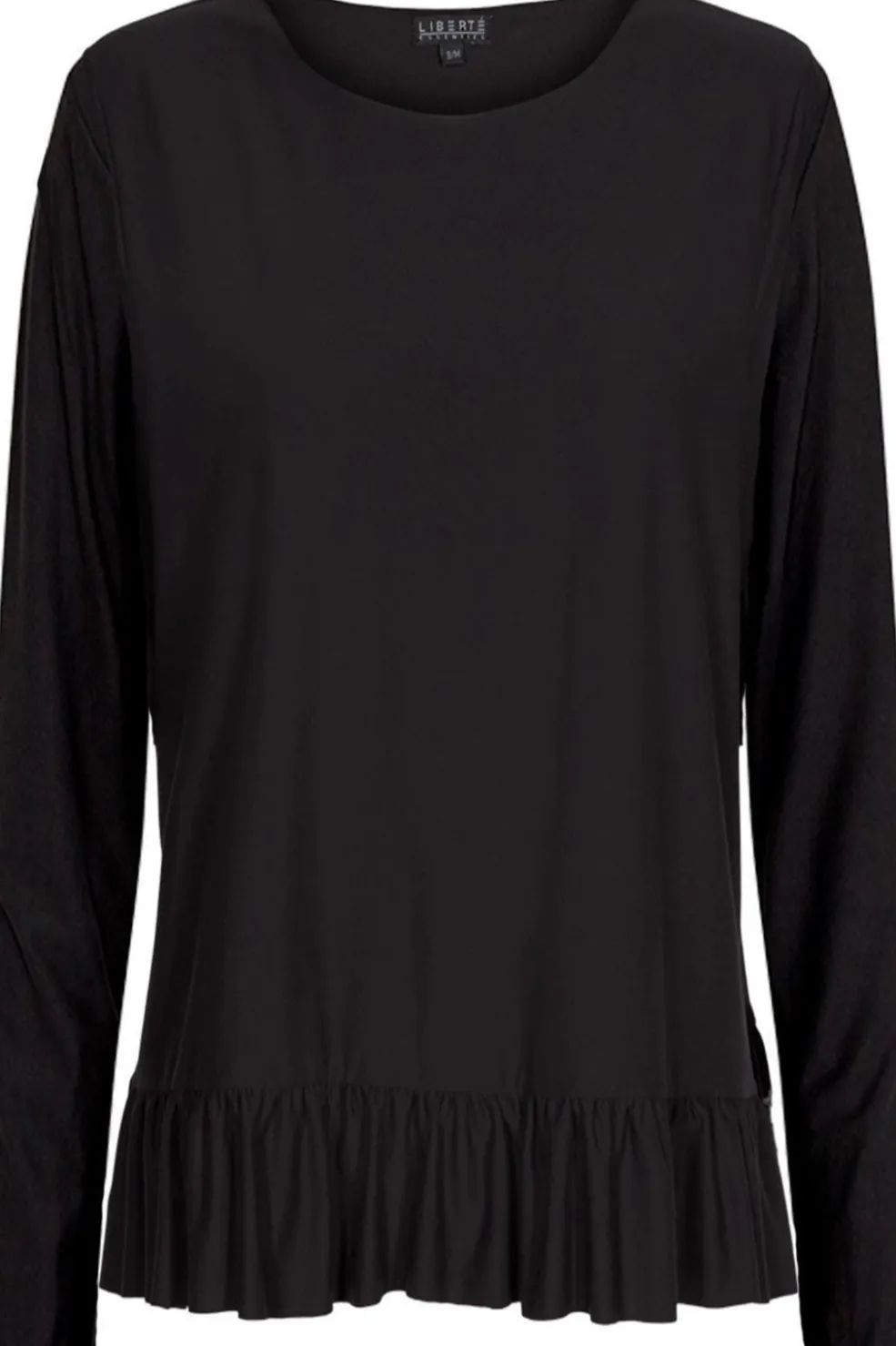 Sort langærmet t-shirt fra Liberte med flæsedetaljer i bunden. T-shirten har en løs pasform og rund halsudskæring, der giver god bevægelsesfrihed.