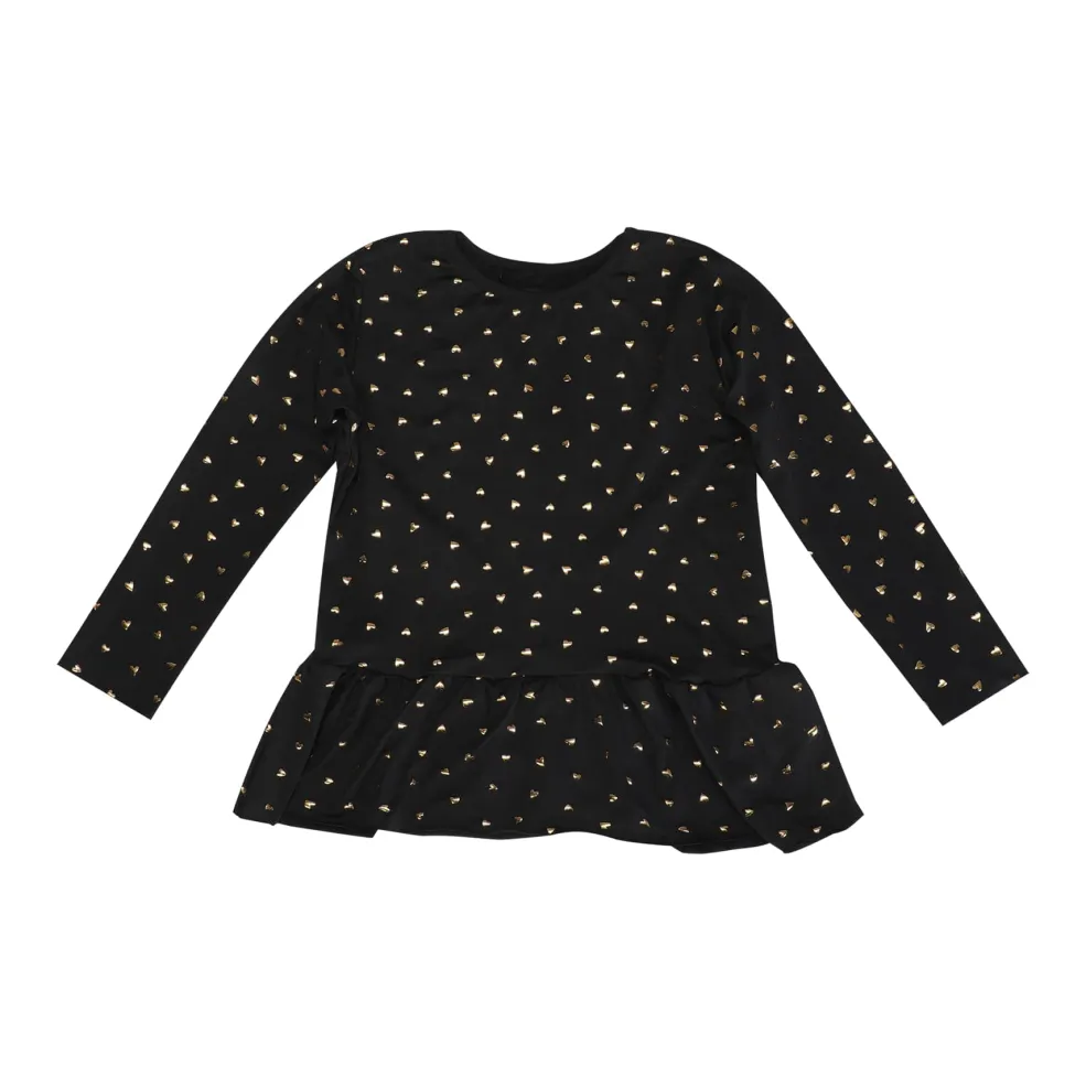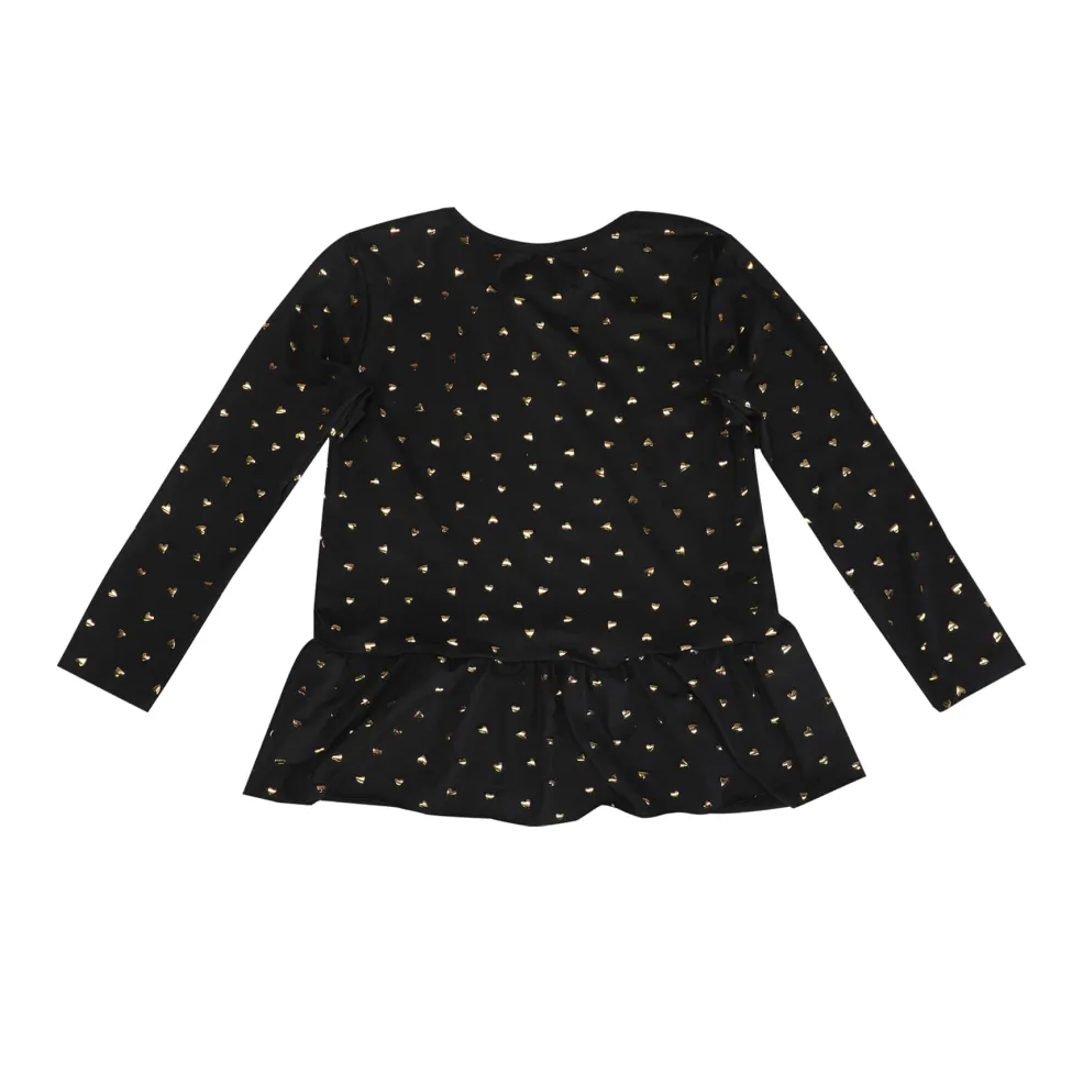 Sort langærmet T-shirt fra Liberté Ami med guldfarvet hjerteprint. T-shirten har flæsedetalje ved bunden og rund halsudskæring.