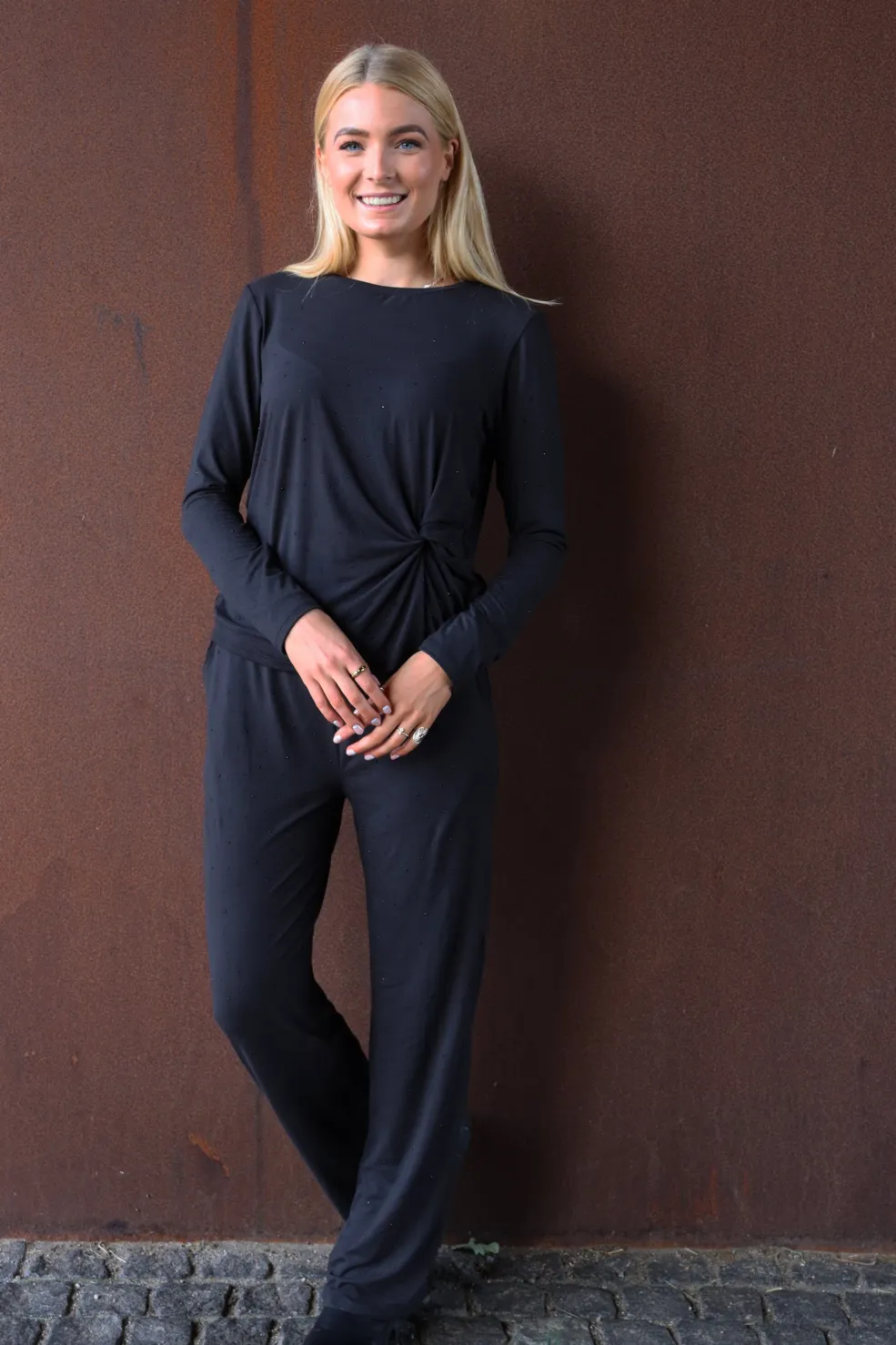 Sort t-shirt fra Liberte, lavet af 90 % polyester og 10 % elastan. Blandingen giver stræk og holder formen over tid.