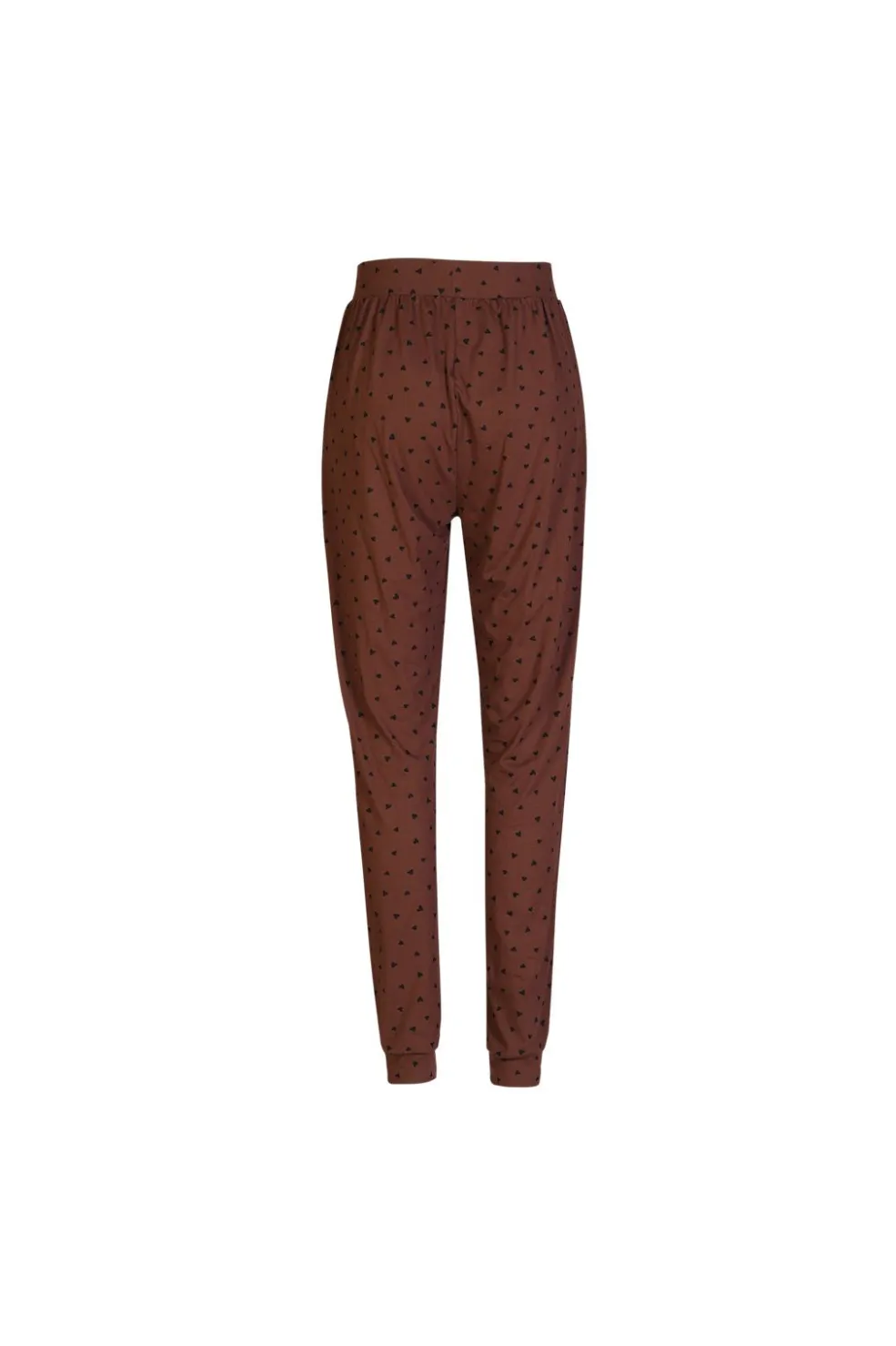 Brune bukser fra Liberte med sorte hjerteprint. Bukserne har en løs pasform og er lavet i blød Alma-kvalitet til afslapning derhjemme.
