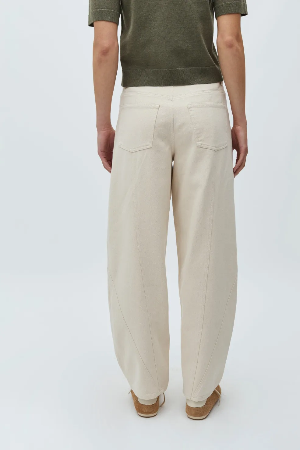 Brede bukser fra MbyM i naturlige toner af hvid og creme. Bukserne har en høj talje og en løs pasform, der går til midt på læggen.