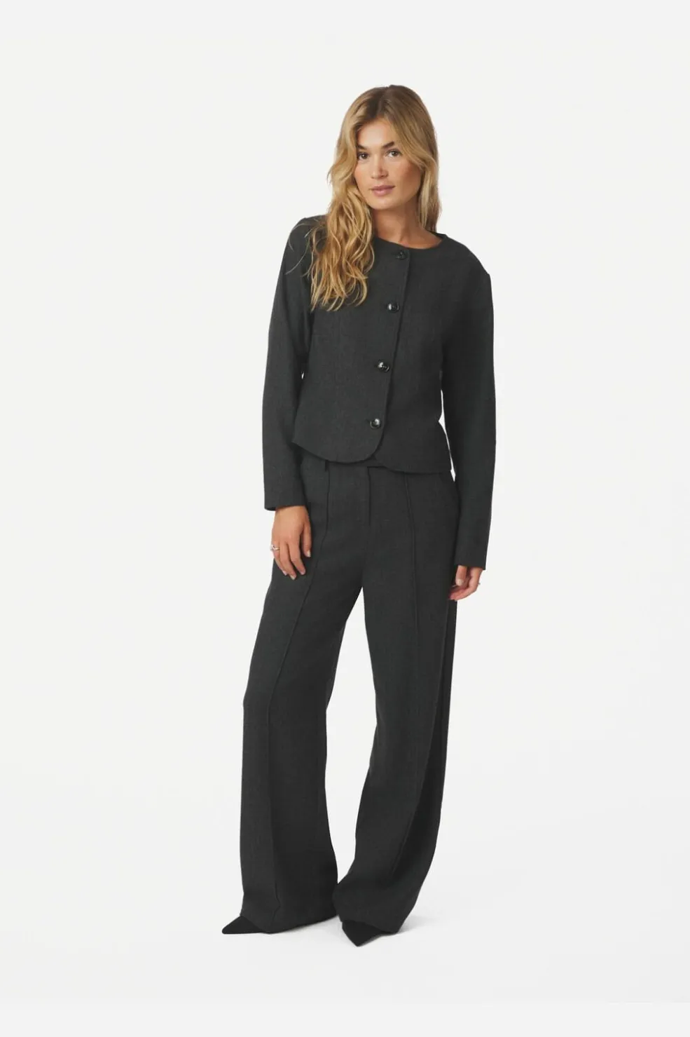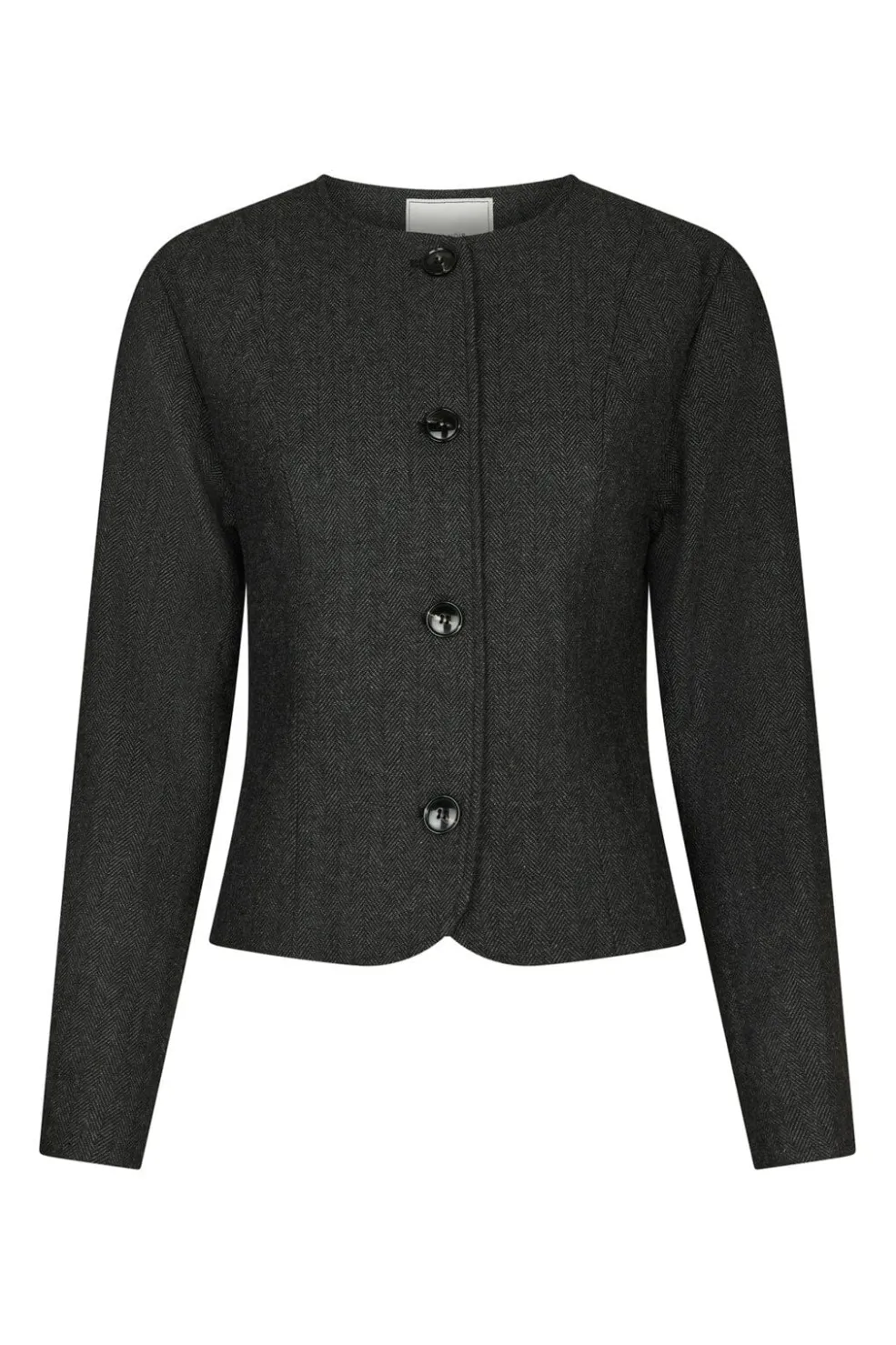Antracitfarvet jakke fra Neo Noir med herringbone-mønster. Jakken har en fitted pasform med buede ærmer og knaplukning foran.