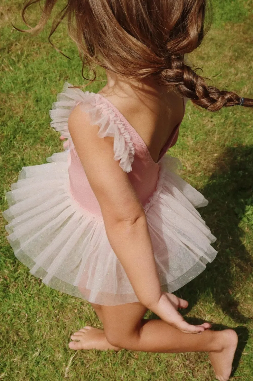 Tylskørtet og de rynkede detaljer skaber en balletinspireret silhuet. De bløde stropper sidder behageligt på skuldrene under vandleg.