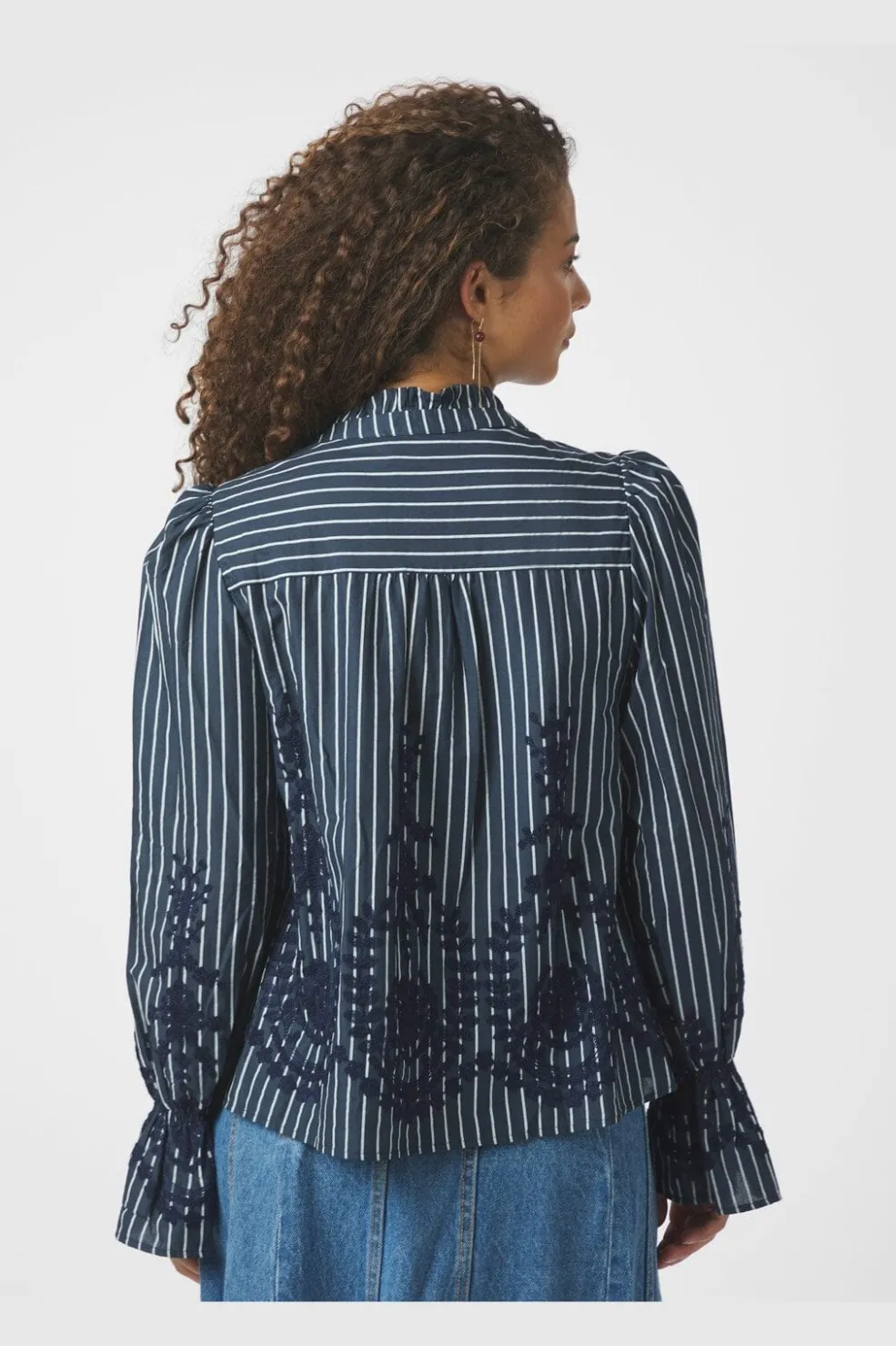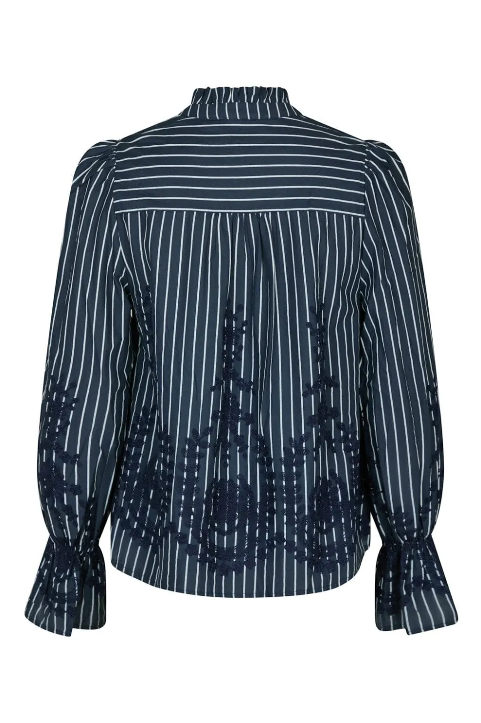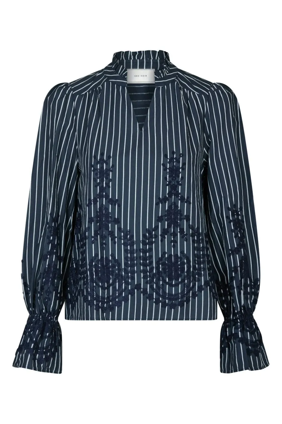 Mørkeblå bluse fra Neo Noir med vertikale striber og broderi. Blusen har en v-halsudskæring og lange ærmer med flared manchetter, der giver et feminint præg.