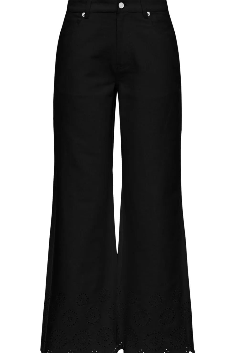 Sorte jeans fra Global Funk med bred benkant og broderede blomstermønstre. Bukserne har en høj talje og en scallop-kant med udskårne detaljer langs bunden.