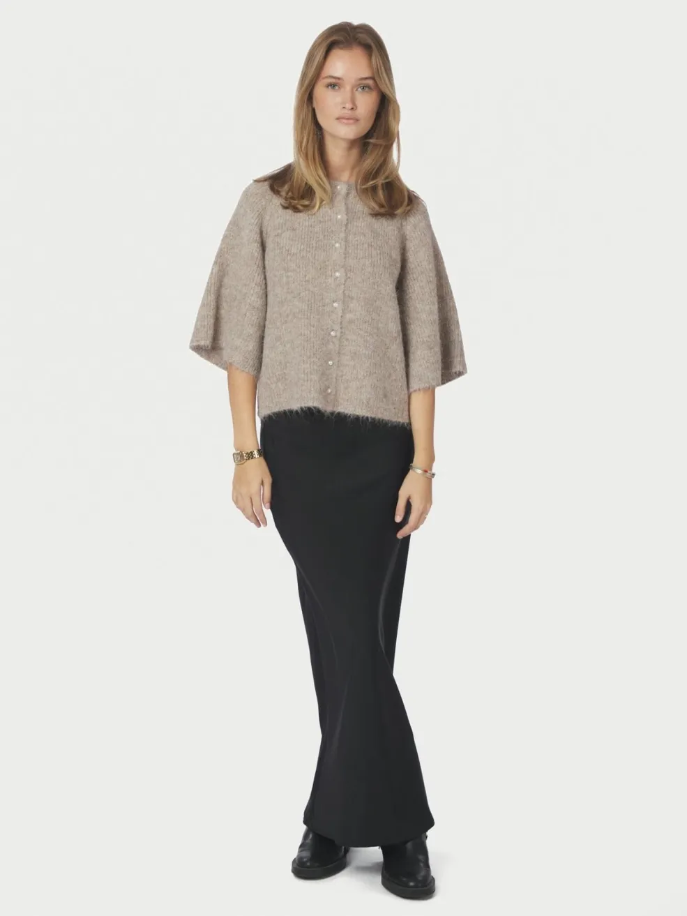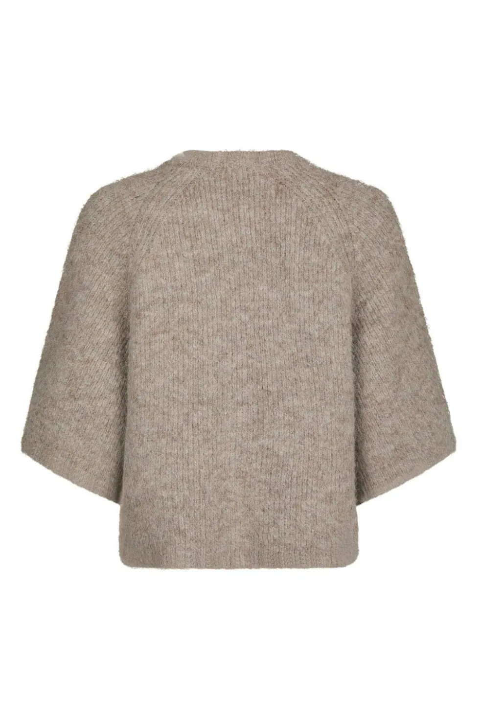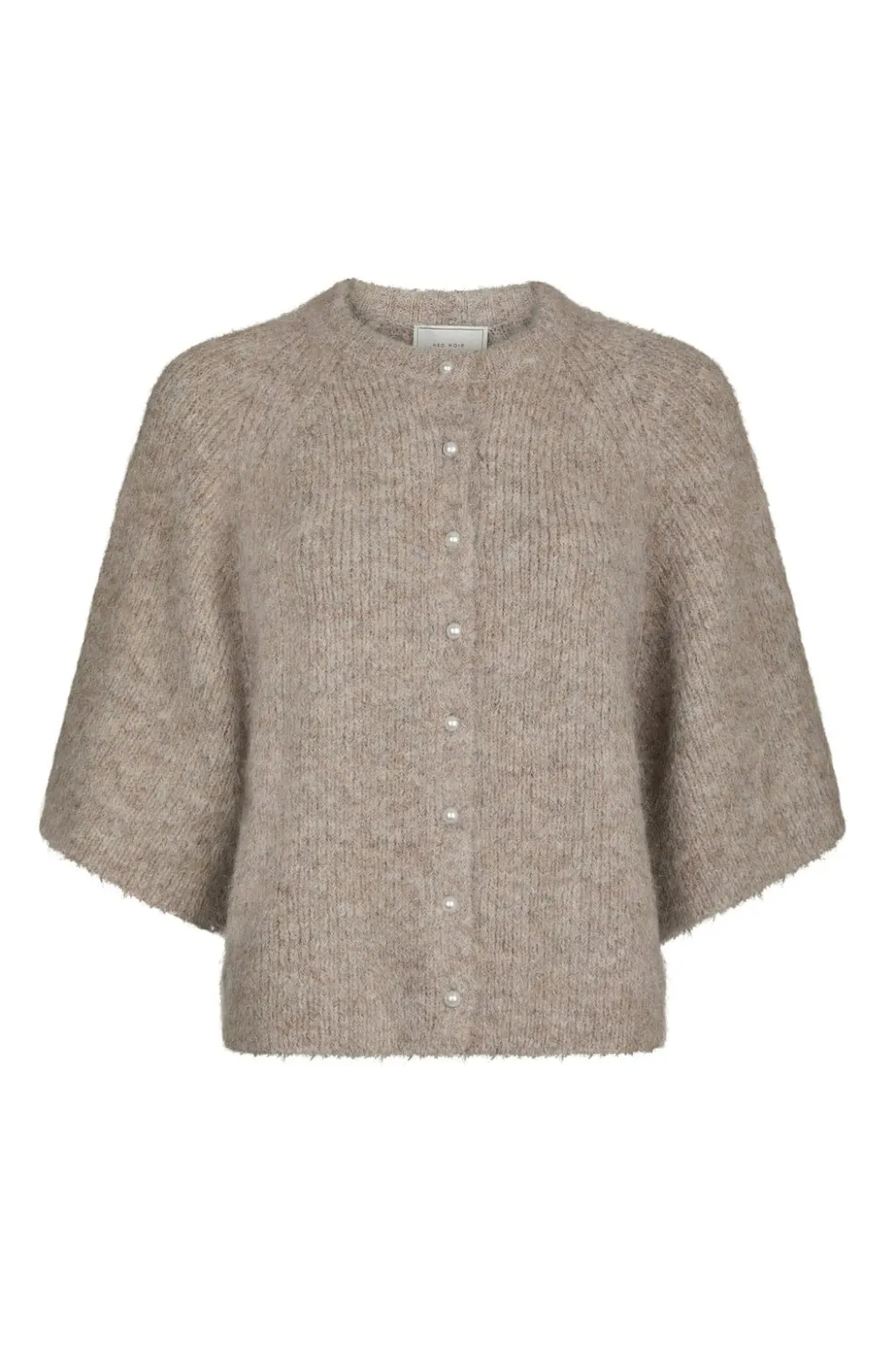 Strikket cardigan fra Neo Noir i meleret beige farve med en blød, fluffy tekstur. Cardiganen har en løs pasform med vidde på ærmerne.