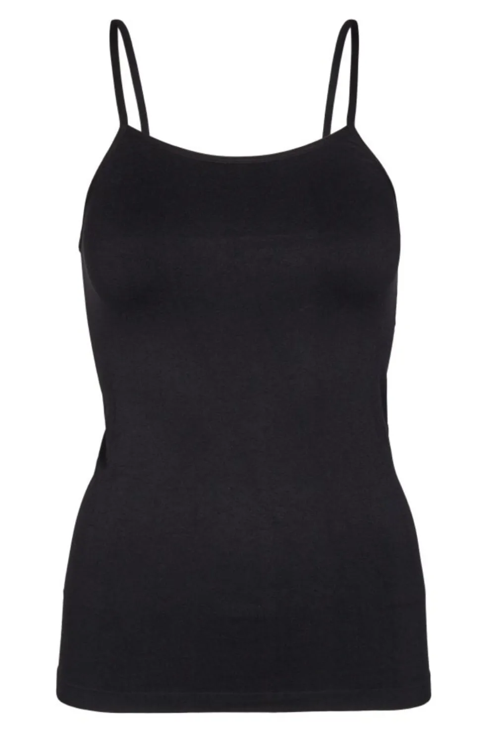 Sort top fra Amazing Basic med tynde stropper og rund halsudskæring. Toppen har en tætsiddende pasform og er lavet af et elastisk materiale, der følger kroppens bevægelser.